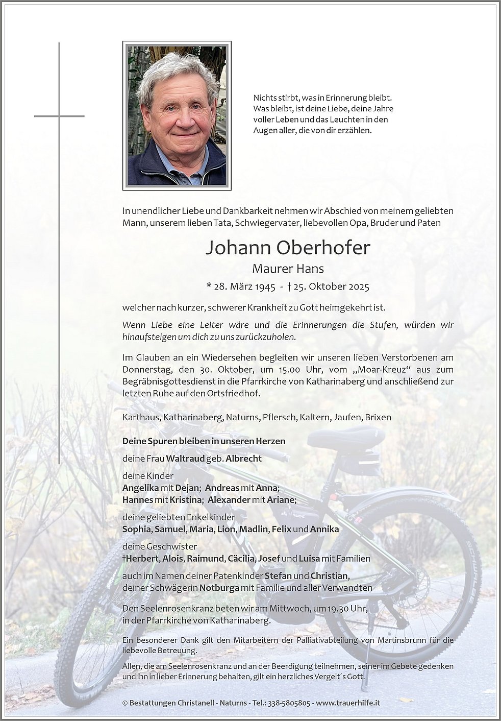 Im Glauben an ein Wiedersehen begleiten wir unseren lieben Verstorbenen am Donnerstag, den 30. Oktober, um 15.00 Uhr, vom „Moar-Kreuz“ aus zum Begräbnisgottesdienst in die Pfarrkirche von Katharinaberg und anschließend zur letzten Ruhe auf den Ortsfriedhof.