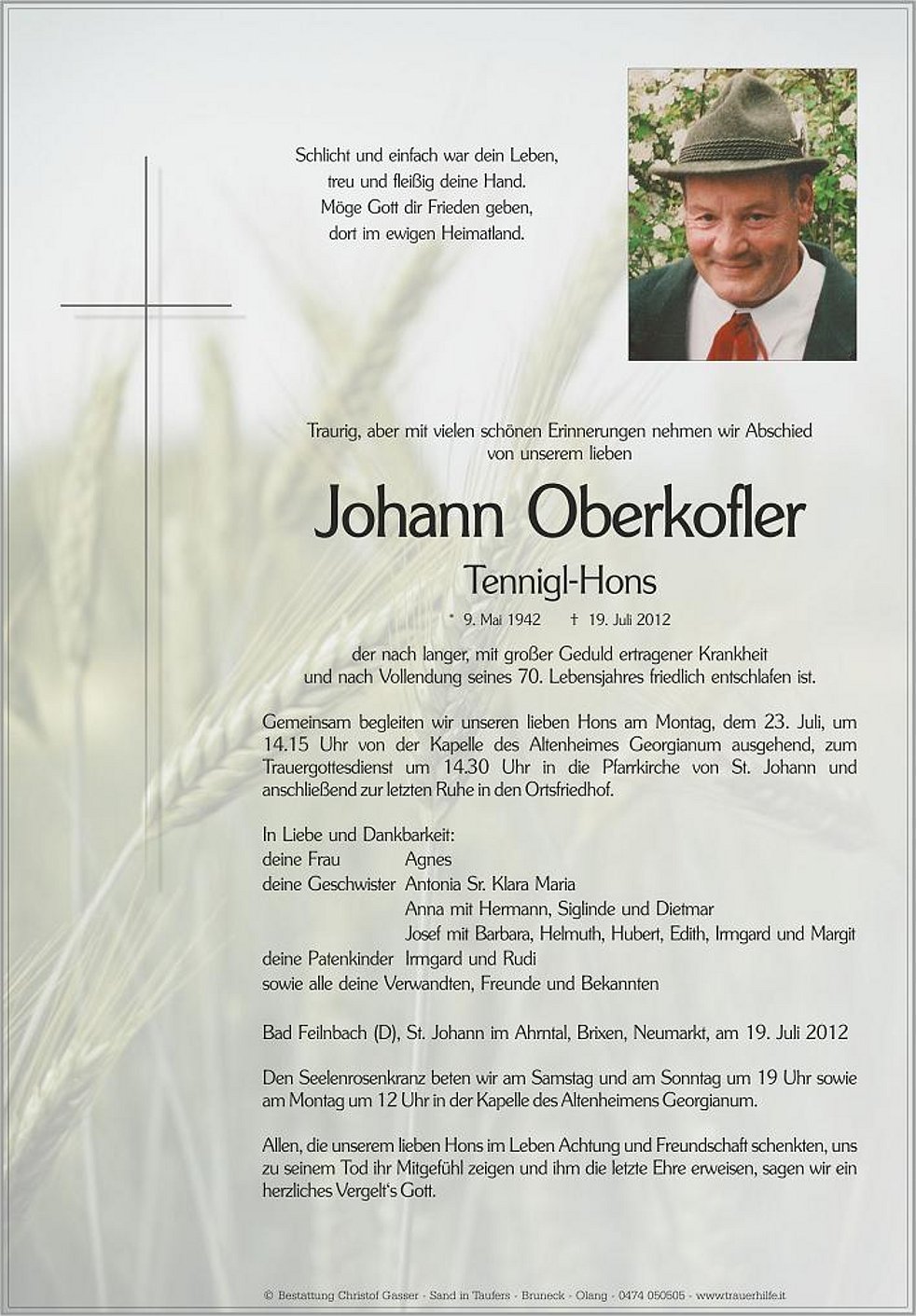 14.15 Uhr von der Kapelle des Altenheimes Georgianum ausgehend, zum Trauergottesdienst um 14.30 Uhr in die Pfarrkirche von St. Johann und anschließend zur letzten Ruhe in den Ortsfriedhof.
