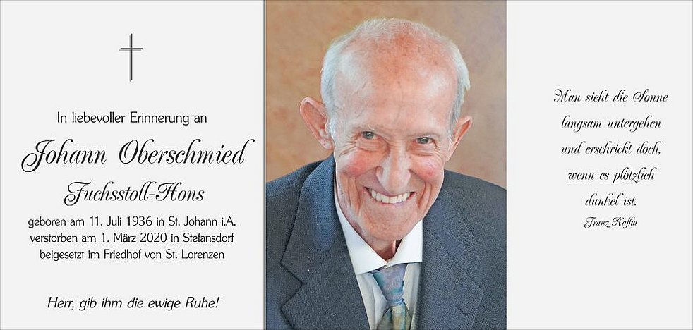 Gemeinsam begleiten wir unseren lieben Tate am Dienstag, 3. März, um 13.15 Uhr vom Trauerhaus ausgehend, zum Abschiedsgottesdienst um 14.30 Uhr in die Pfarrkirche von St. Lorenzen. Anschließend übergeben wir ihn der geweihten Erde.