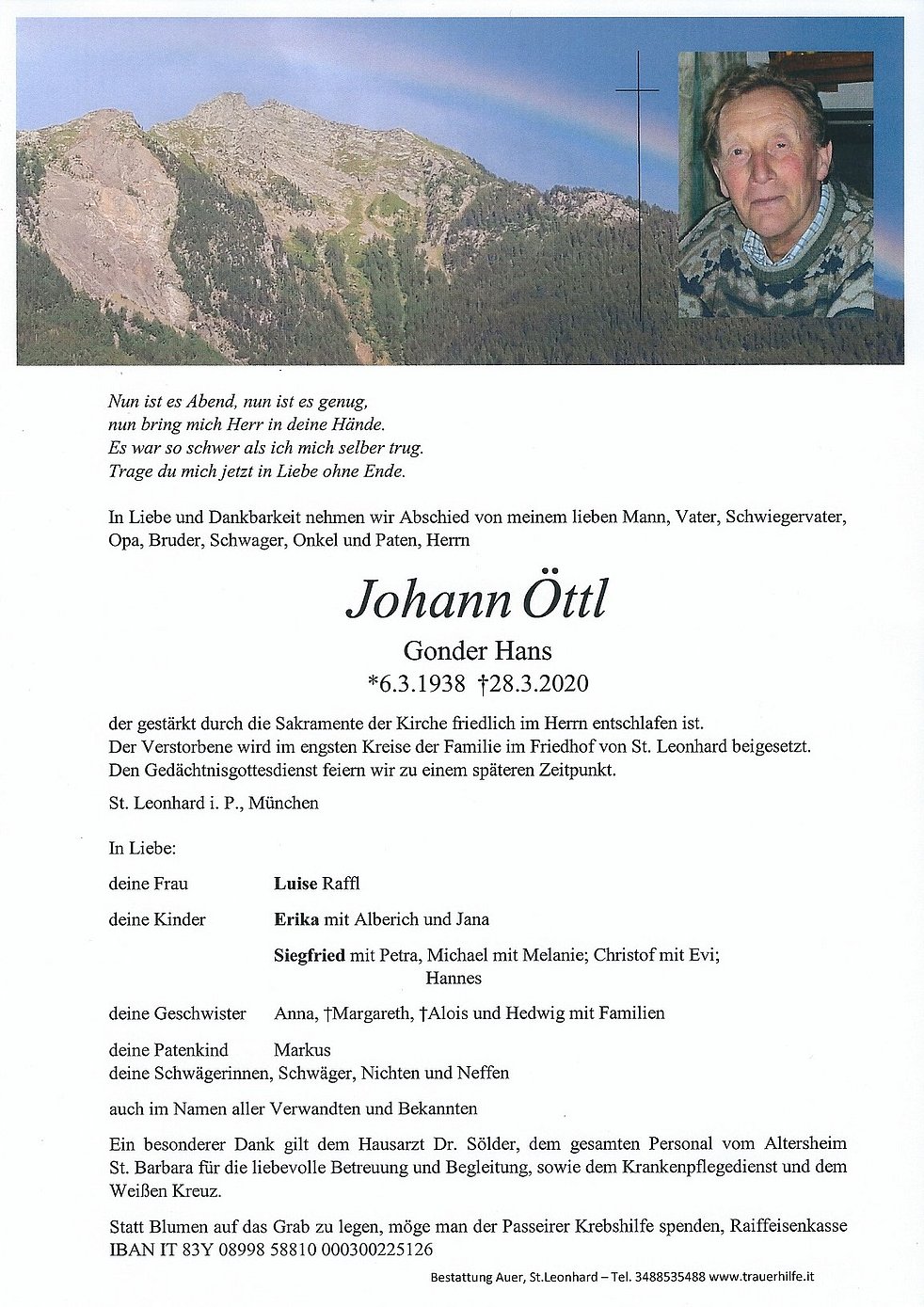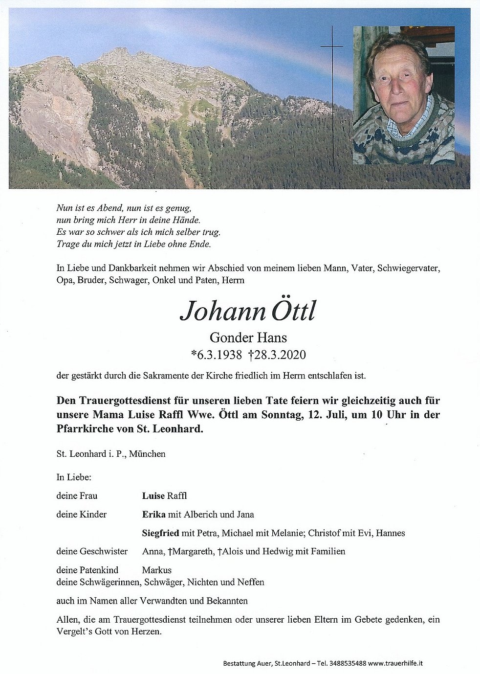 Den Trauergottesdienst für unseren lieben Tate feiern wir gleichzeitig auch für unsere Mama Luise Raffl Wwe. Öttl am Sonntag, 12. Juli, um 10 Uhr in der Pfarrkirche von St. Leonhard.