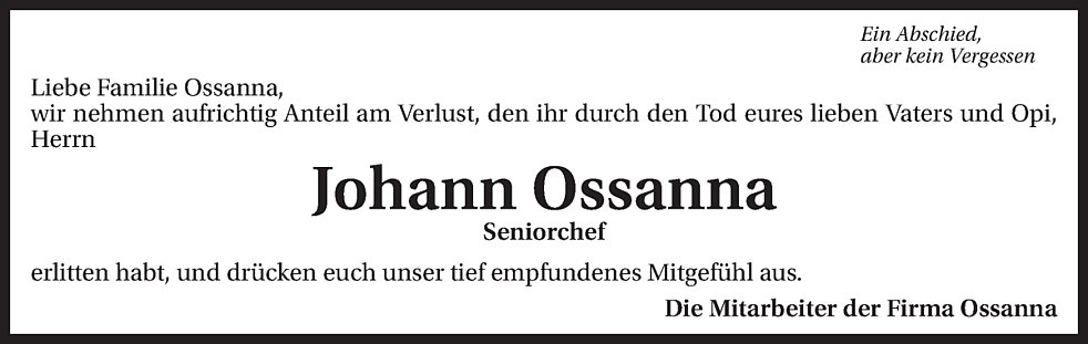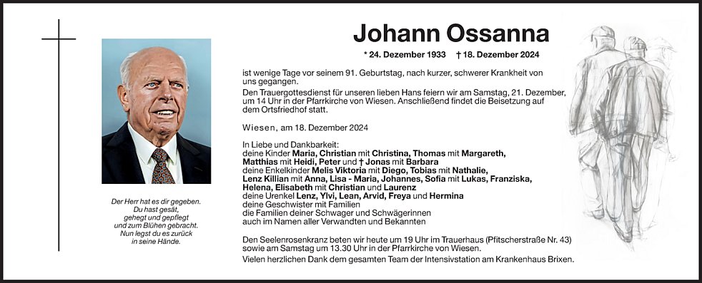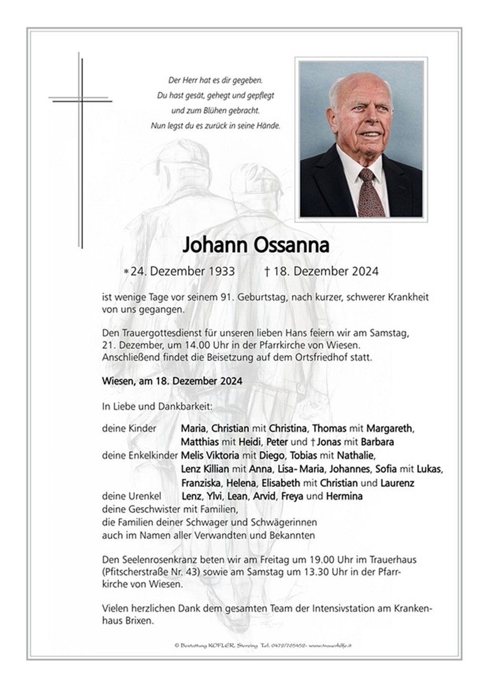Den Trauergottesdienst für unseren lieben Hans feiern wir am Samstag, 21. Dezember, um 14.00 Uhr in der Pfarrkirche von Wiesen.