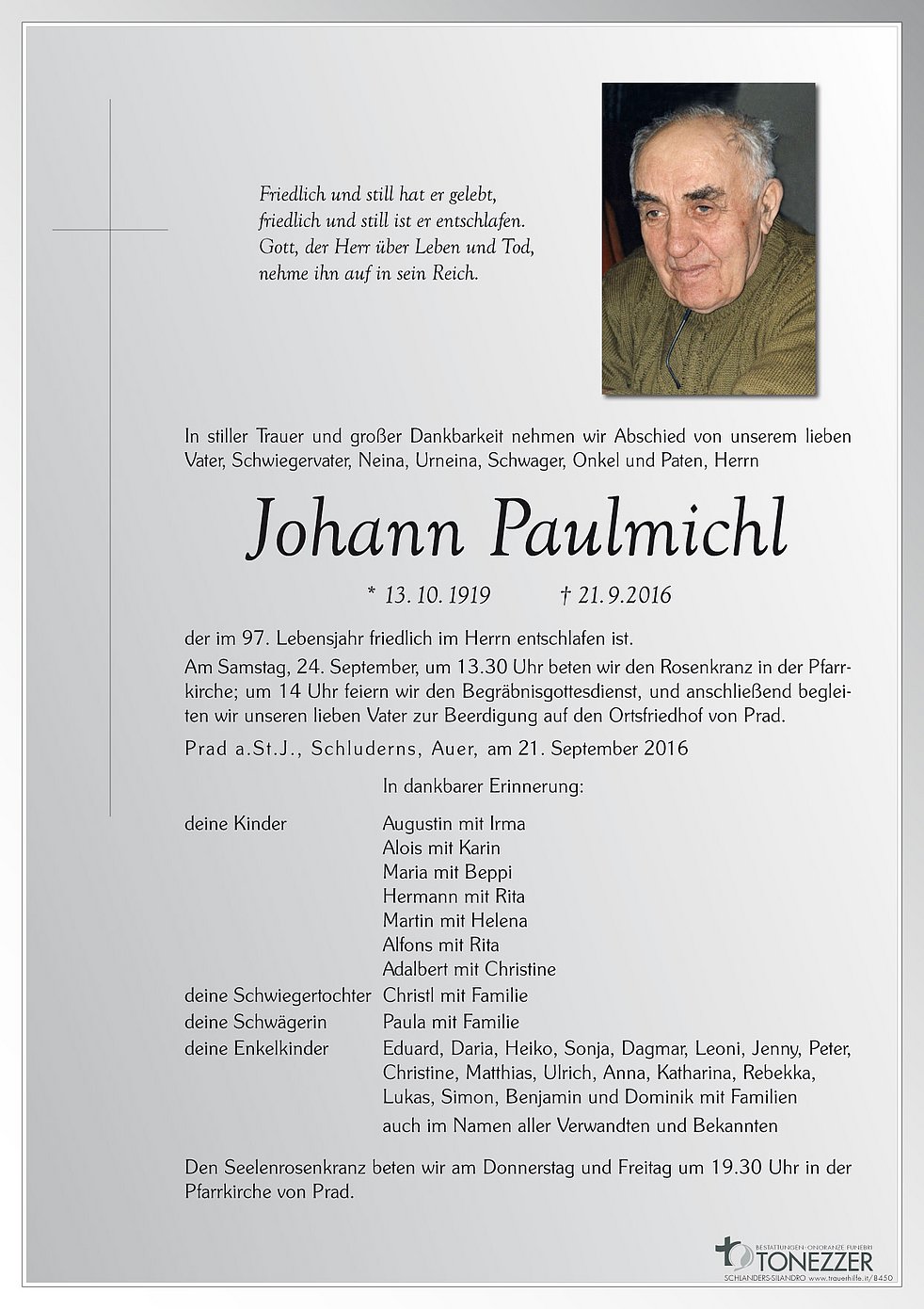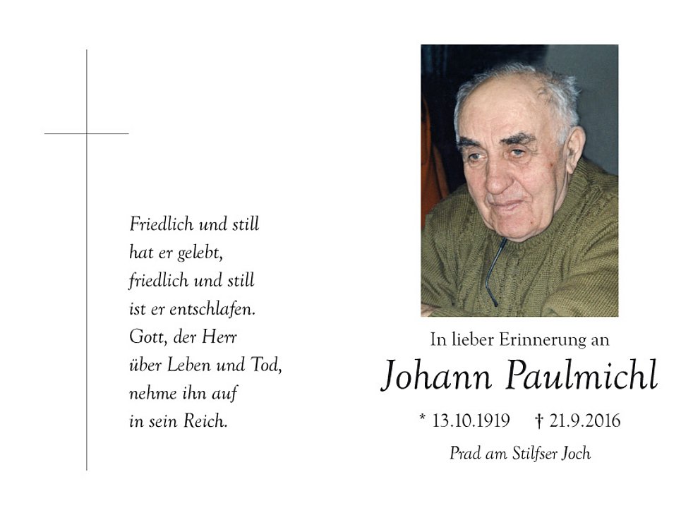 Am Samstag, 24. September, um 13.30 Uhr beten wir den Rosenkranz in der Pfarrkirche; um 14 Uhr feiern wir den Begräbnisgottesdienst, und anschließend begleiten wir unseren lieben Vater zur Beerdigung auf den Ortsfriedhof von Prad.