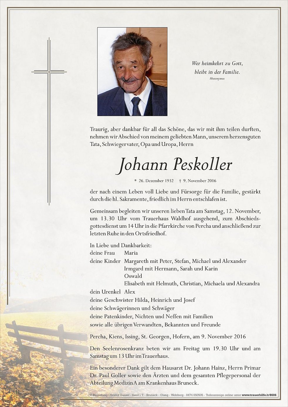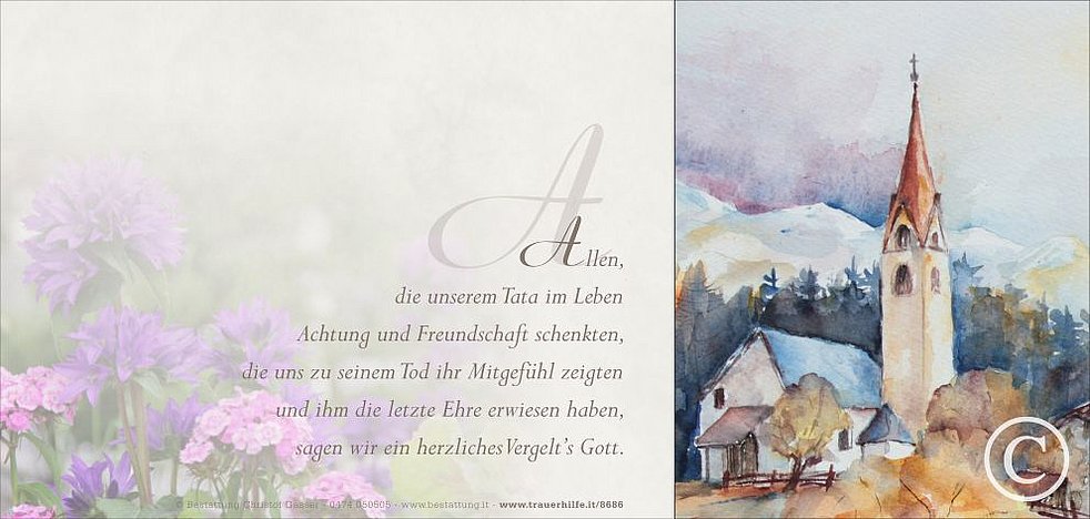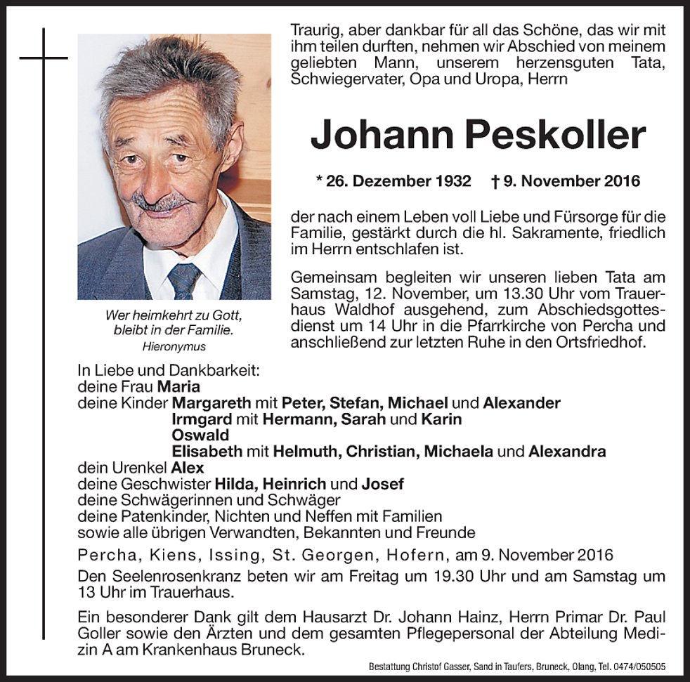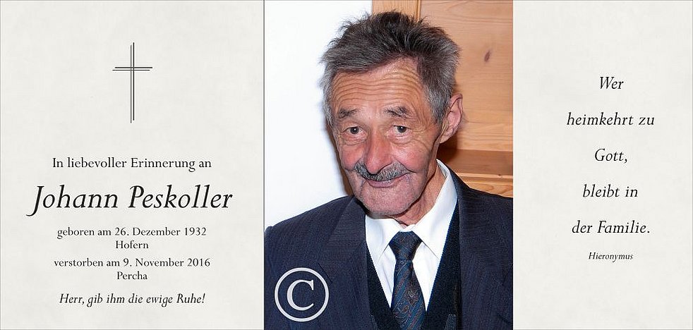 Gemeinsam begleiten wir unseren lieben Tata am Samstag, 12. November, um 13.30 Uhr vom Trauerhaus Waldhof ausgehend, zum Abschiedsgottesdienst um 14 Uhr in die Pfarrkirche von Percha und anschließend zur letzten Ruhe in den Ortsfriedhof.