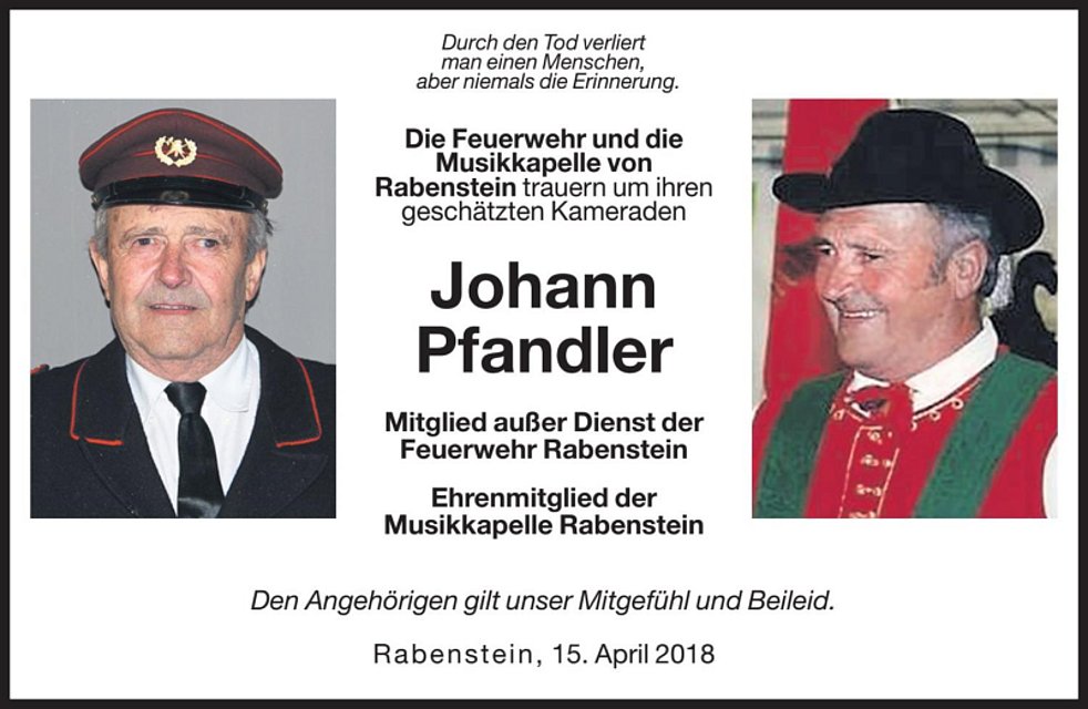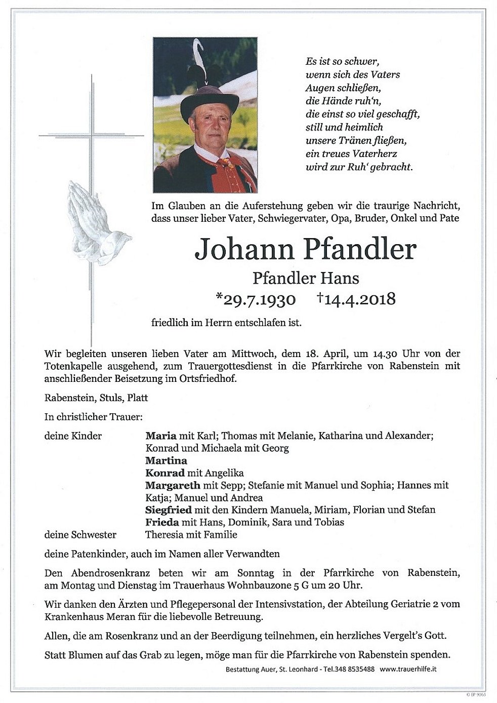 Wir begleiten unseren lieben Vater am Mittwoch, dem 18. April, um 14.30 Uhr von der Totenkapelle ausgehend, zum Trauergottesdienst in die Pfarrkirche von Rabenstein mit anschließender Beisetzung im Ortsfriedhof.