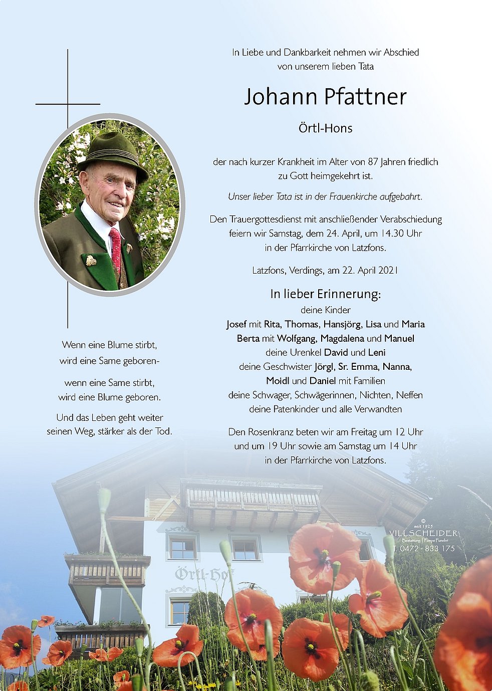 Trauerfeier: 24.04. - 14:30 Uhr Latzfons