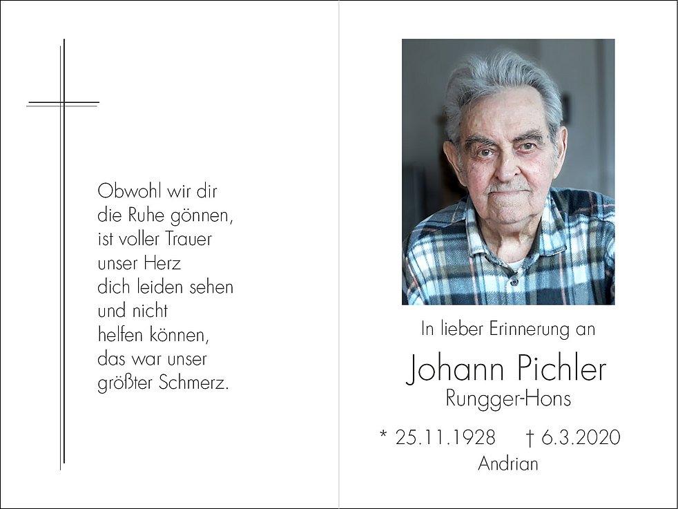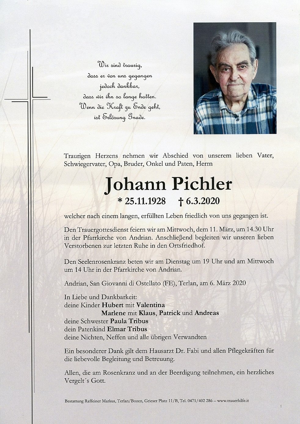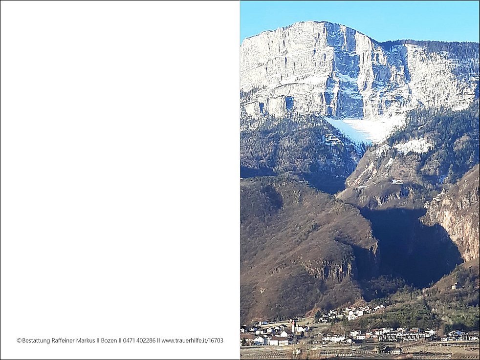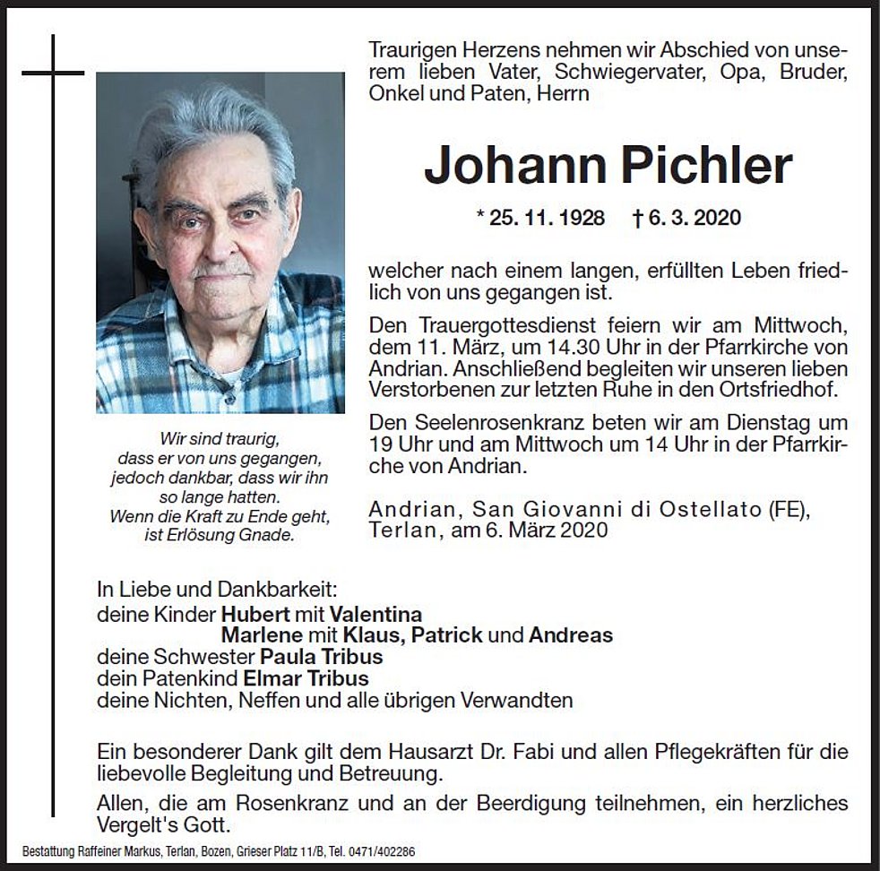 Den Trauergottesdienst feiern wir am Mittwoch, dem 11. März, um 14.30 Uhr in der Pfarrkirche von Andrian. Anschlieβend begleiten wir unseren lieben Verstorbenen zur letzten Ruhe in den Ortsfriedhof.
