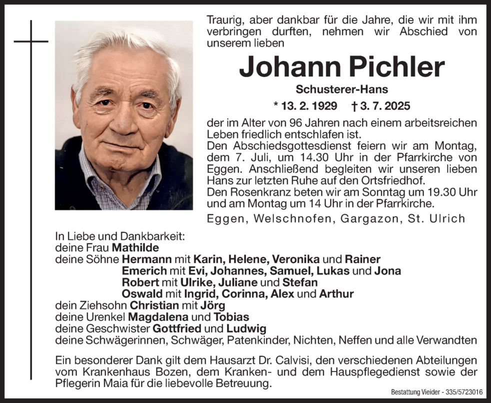 Ein besonderer Dank gilt dem Hausarzt Dr. Calvisi, den verschiedenen Abteilungen vom Krankenhaus Bozen, dem Kranken- und dem Hauspflegedienst sowie der Pflegerin Maia für die liebevolle Betreuung.