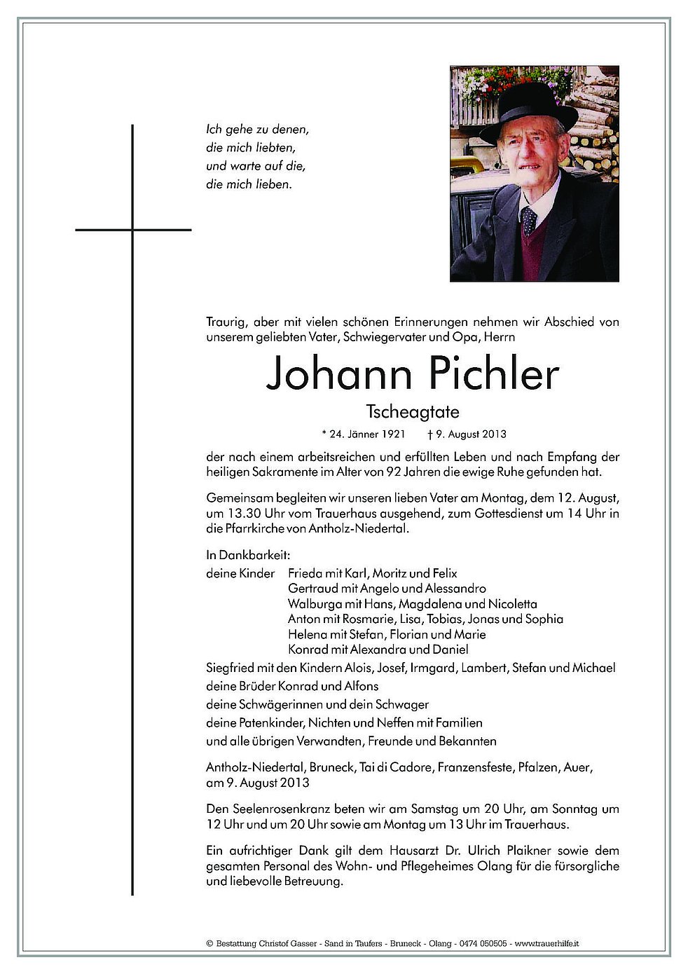 Gemeinsam begleiten wir unseren lieben Vater am Montag, dem 12. August, um 13.30 Uhr vom Trauerhaus ausgehend, zum Gottesdienst um 14 Uhr in die Pfarrkirche von Antholz-Niedertal.