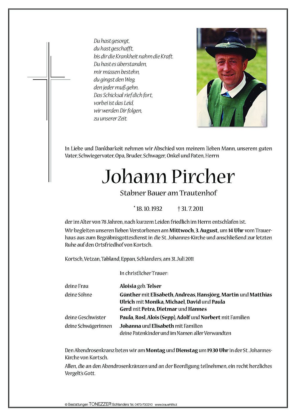 Wir begleiten unseren lieben Verstorbenen am Mittwoch, 3. August, um 14 Uhr vom Trauerhaus aus zum Begräbnisgottesdienst in die St. Johannes-Kirche und anschließend zur letzten Ruhe auf den Ortsfriedhof von Kortsch.
