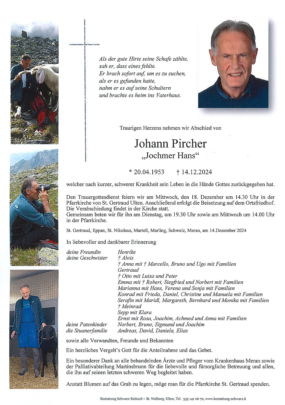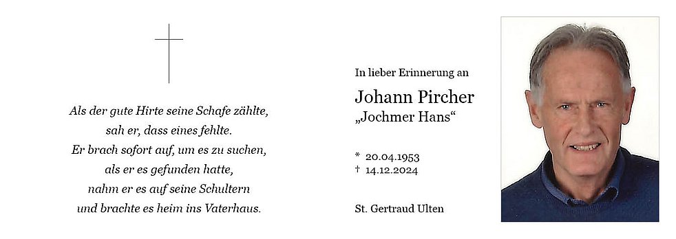 Den Trauergottesdienst feiern wir am Mittwoch, den 18. Dezember um 14.30 Uhr in der Pfarrkirche von St. Gertraud Ulten. Anschließend erfolgt die Beisetzung auf dem Ortsfriedhof. Die Verabschiedung findet in der Kirche statt.