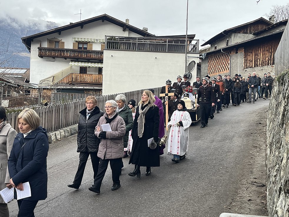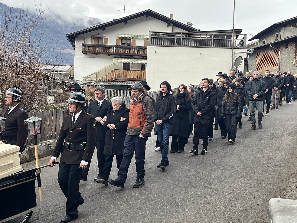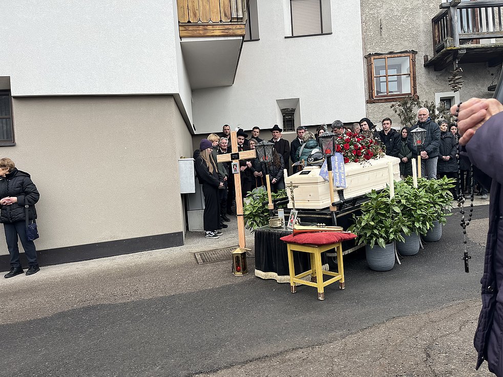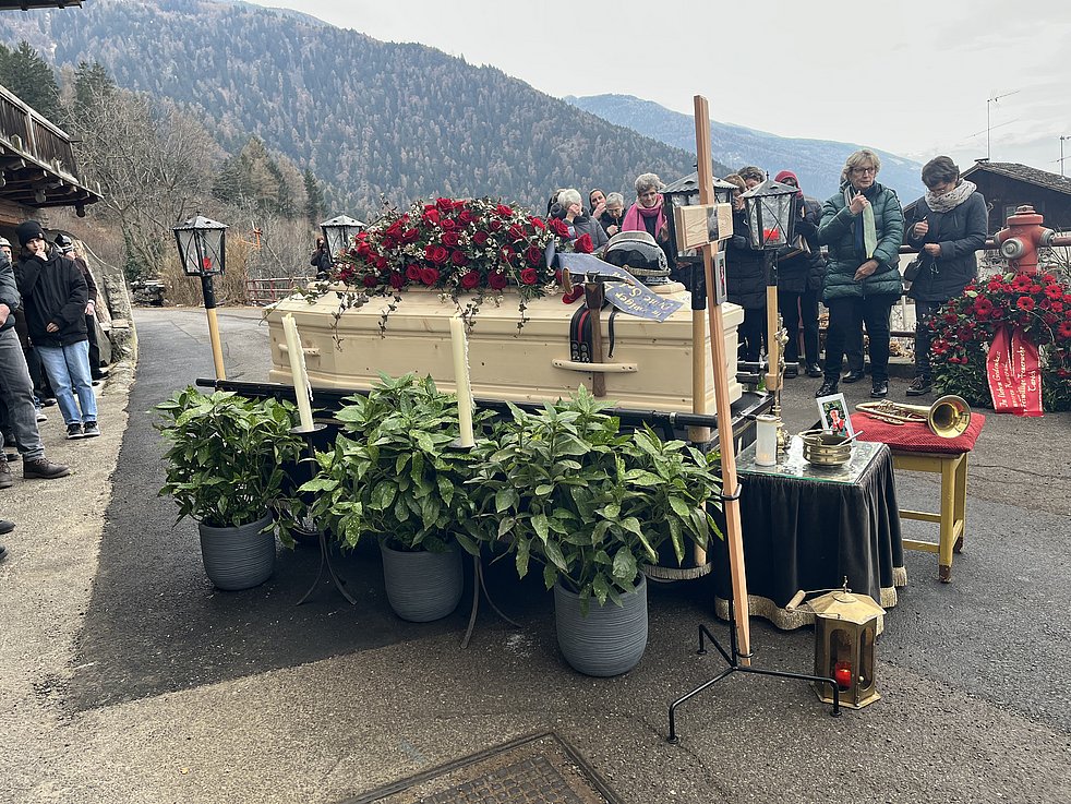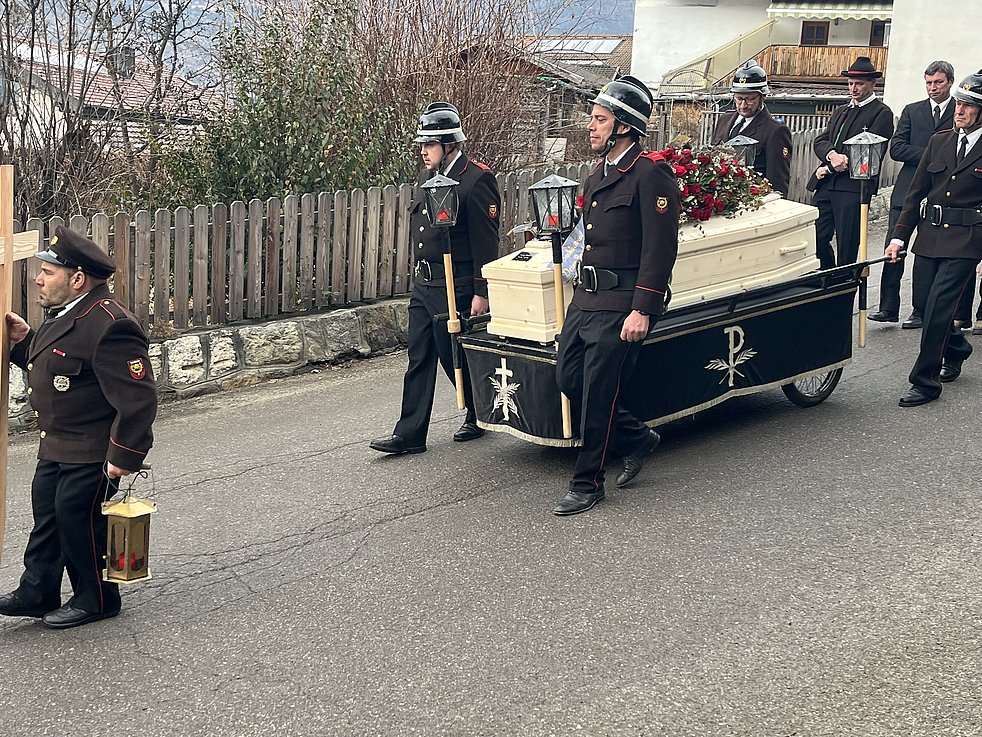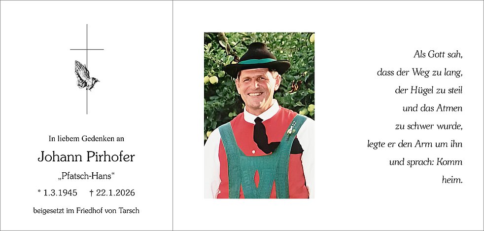Wir begleiten unseren lieben Verstorbenen am Samstag, 24. Januar, um 14 Uhr vom Pfatschhof (Kreischteggweg 7) ausgehend zum Begräbnisgottesdienst in die Pfarrkirche und anschließend zur letzten Ruhe auf den Ortsfriedhof von Tarsch.