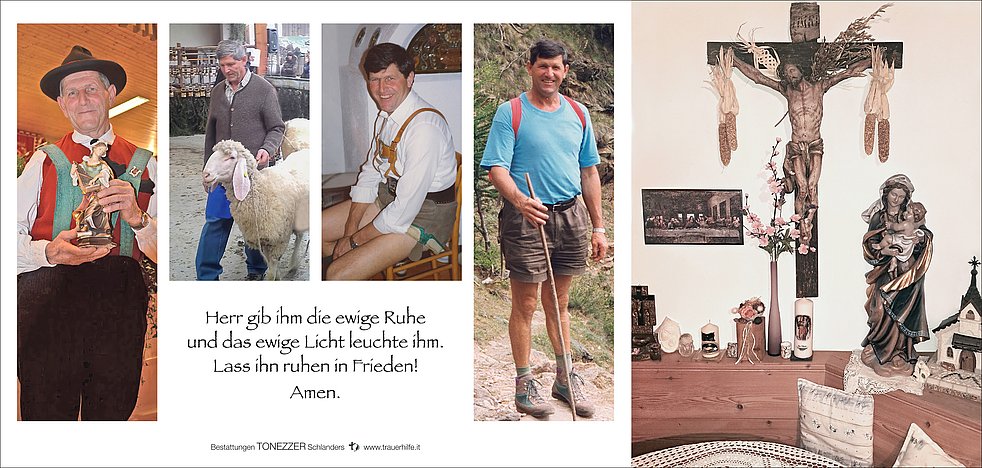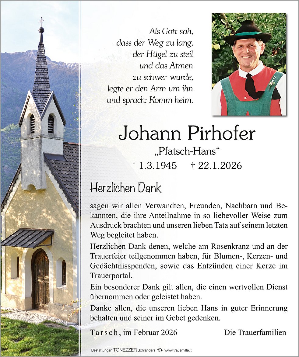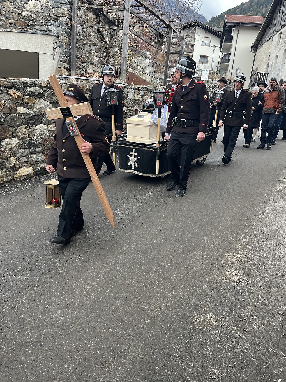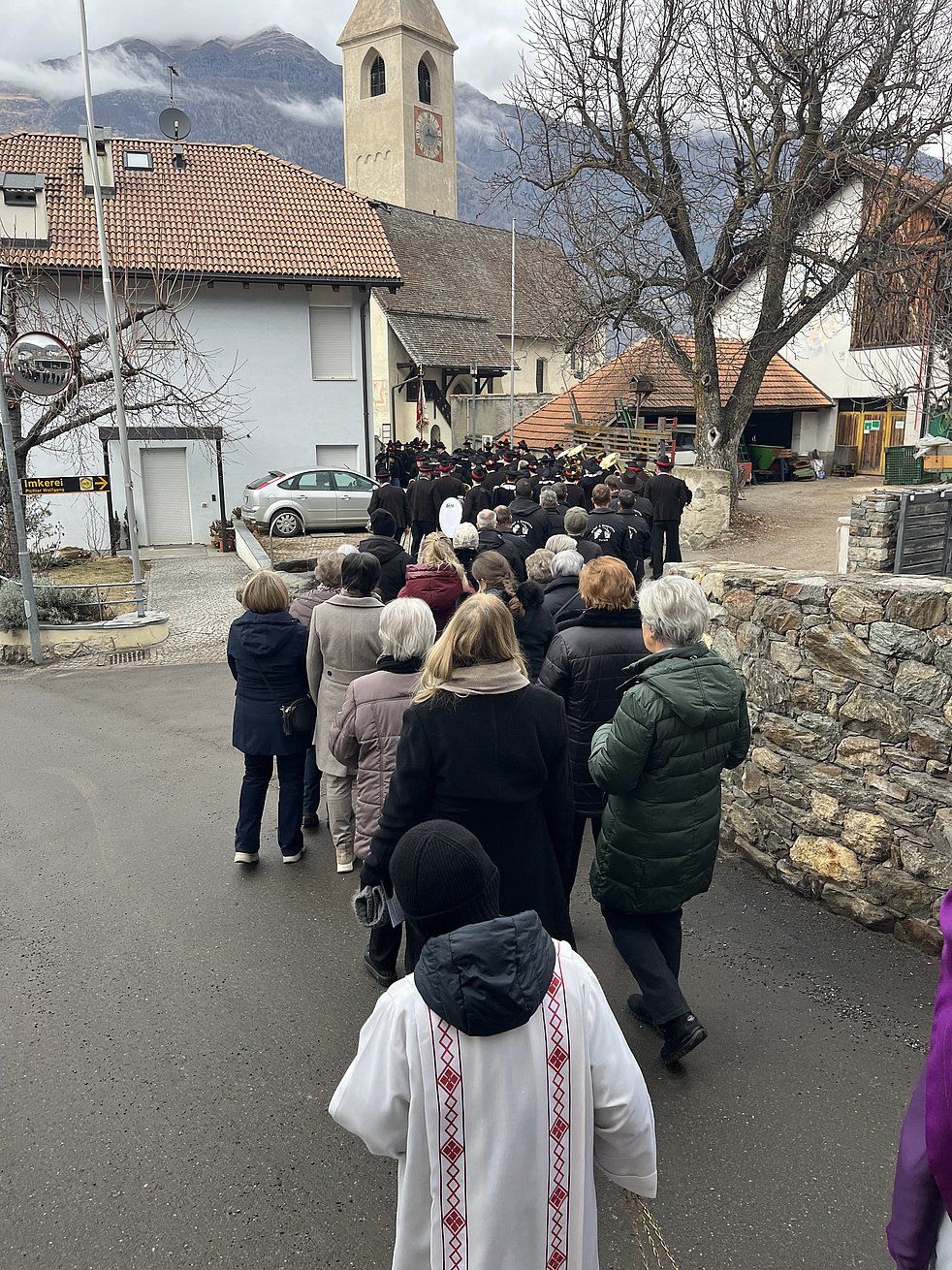 Wir begleiten unseren lieben Verstorbenen am Samstag, 24. Januar, um 14 Uhr vom Pfatschhof (Kreischteggweg 7) ausgehend zum Begräbnisgottesdienst in die Pfarrkirche und anschließend zur letzten Ruhe auf den Ortsfriedhof von Tarsch.