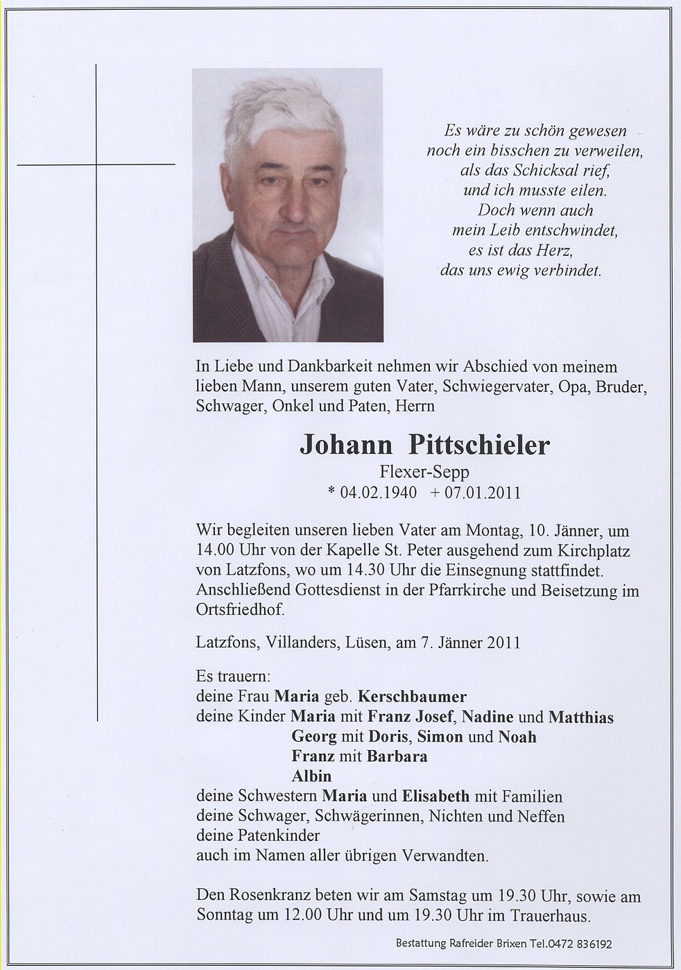 Wir begleiten unseren lieben Vater am Montag, 10. Jänner, um 14.00 Uhr von der Kapelle St. Peter ausgehend zum Kirchplatz von Latzfons, wo um 14.30 Uhr die Einsegnung stattfindet.