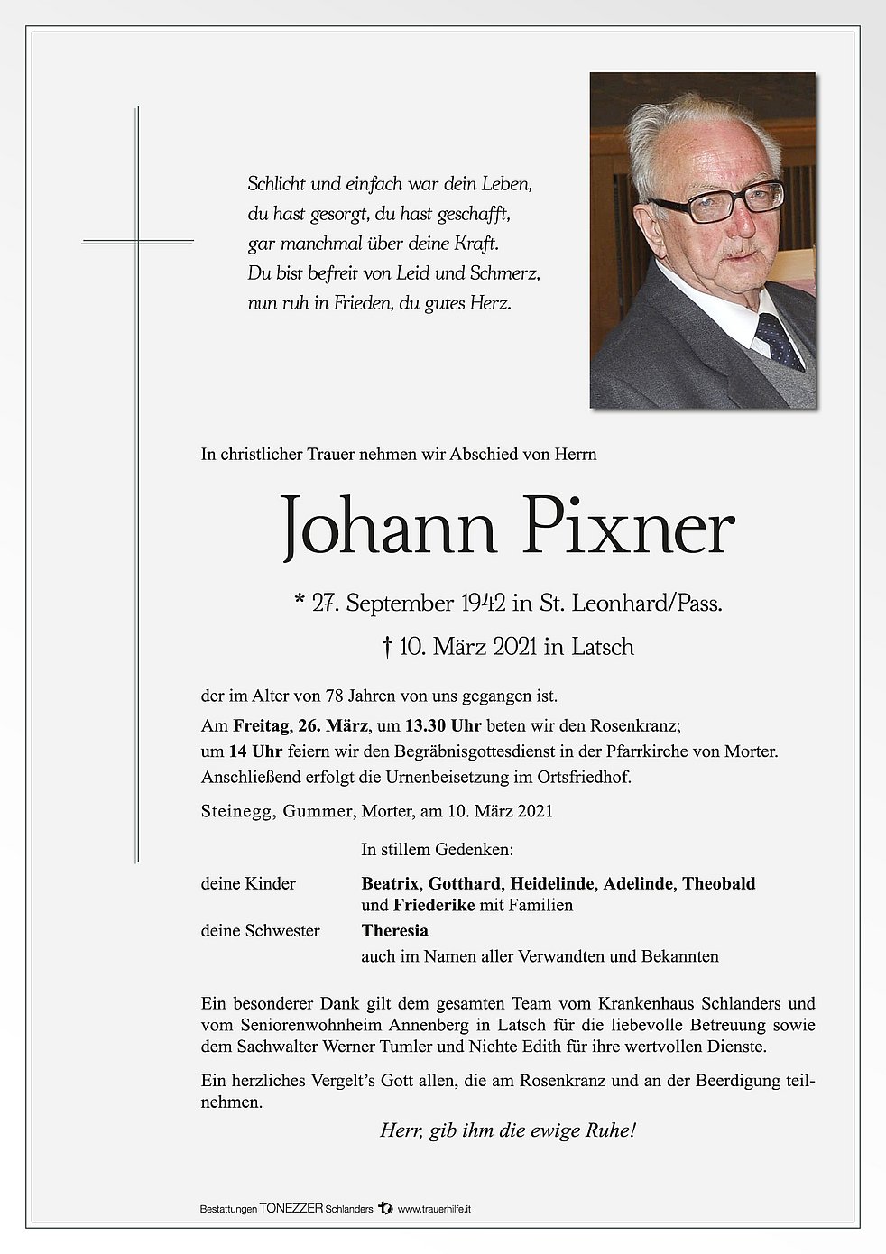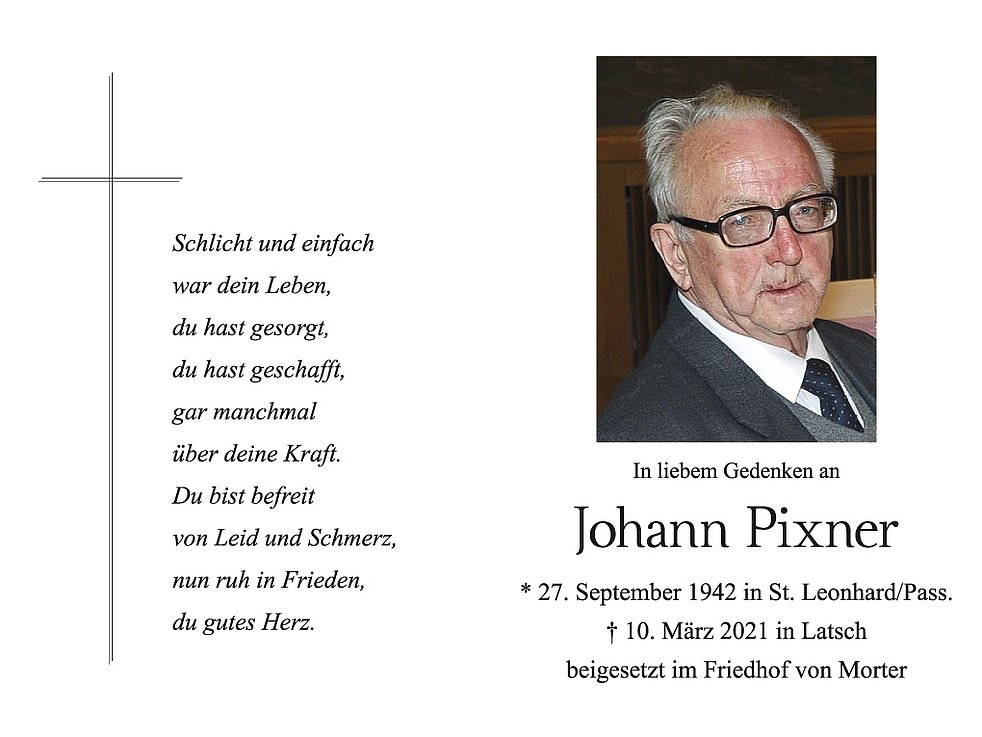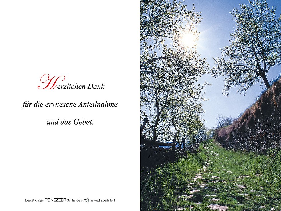 Ein besonderer Dank gilt dem gesamten Team vom Krankenhaus Schlanders und vom Seniorenwohnheim Annenberg in Latsch für die liebevolle Betreuung sowie dem Sachwalter Werner Tumler und Nichte Edith für ihre wertvollen Dienste. Ein herzliches Vergelt’s Gott allen, die am Rosenkranz und an der Beerdigung teilnehmen.