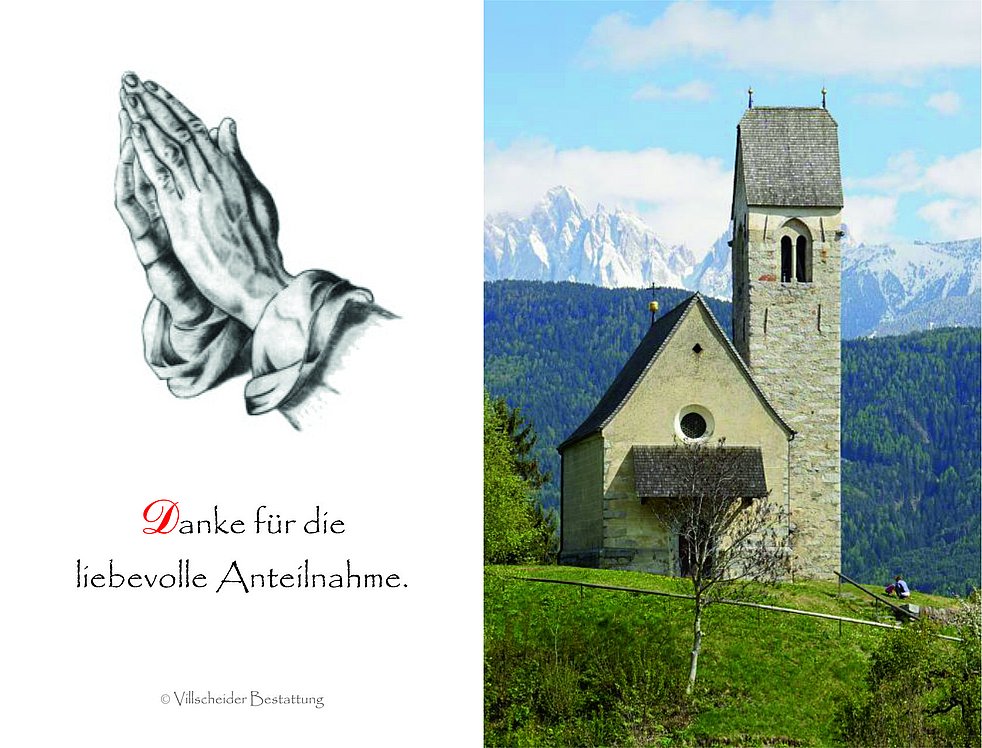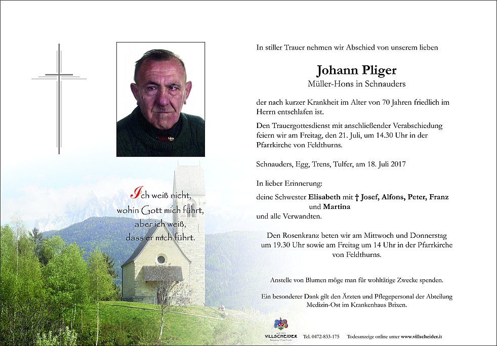 Den Trauergottesdienst mit anschließender Verabschiedung feiern wir am Freitag, den 21. Juli, um 14.30 Uhr in der Pfarrkirche von Feldthurns.