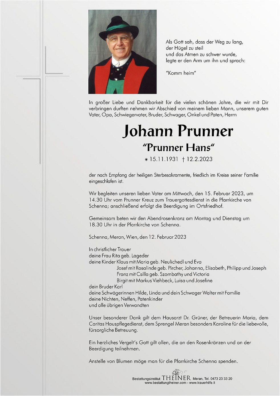Wir begleiten unseren lieben Vater am Mittwoch, den 15. Februar 2023, um 14.30 Uhr vom Prunner Kreuz zum Trauergottesdienst in die Pfarrkirche von Schenna; anschließend erfolgt die Beerdigung im Ortsfriedhof.