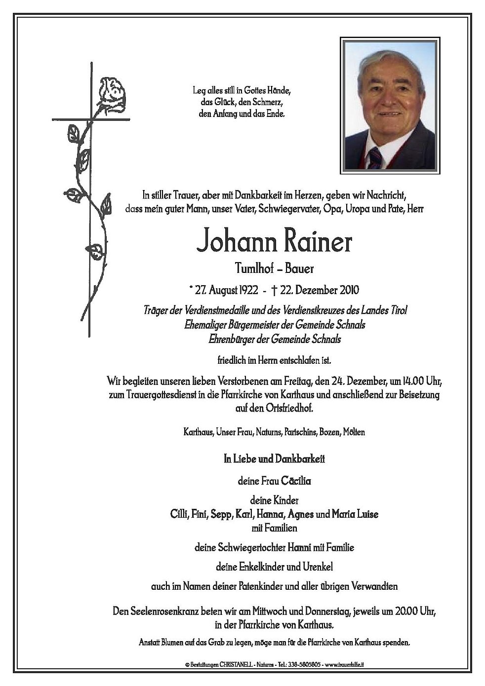 Wir begleiten unseren lieben Verstorbenen am Freitag, den 24. Dezember, um 14.00 Uhr, zum Trauergottesdienst in die Pfarrkirche von Karthaus und anschließend zur Beisetzung auf den Ortsfriedhof.