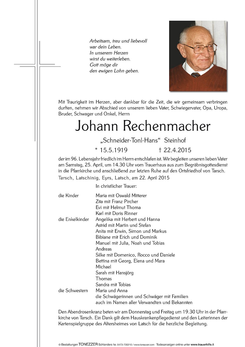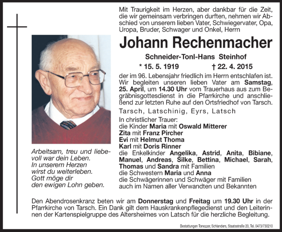 Wir begleiten unseren lieben Vater am Samstag, 25. April, um 14.30 Uhr vom Trauerhaus aus zum Begräbnisgottesdienst in die Pfarrkirche und anschließend zur letzten Ruhe auf den Ortsfriedhof von Tarsch.