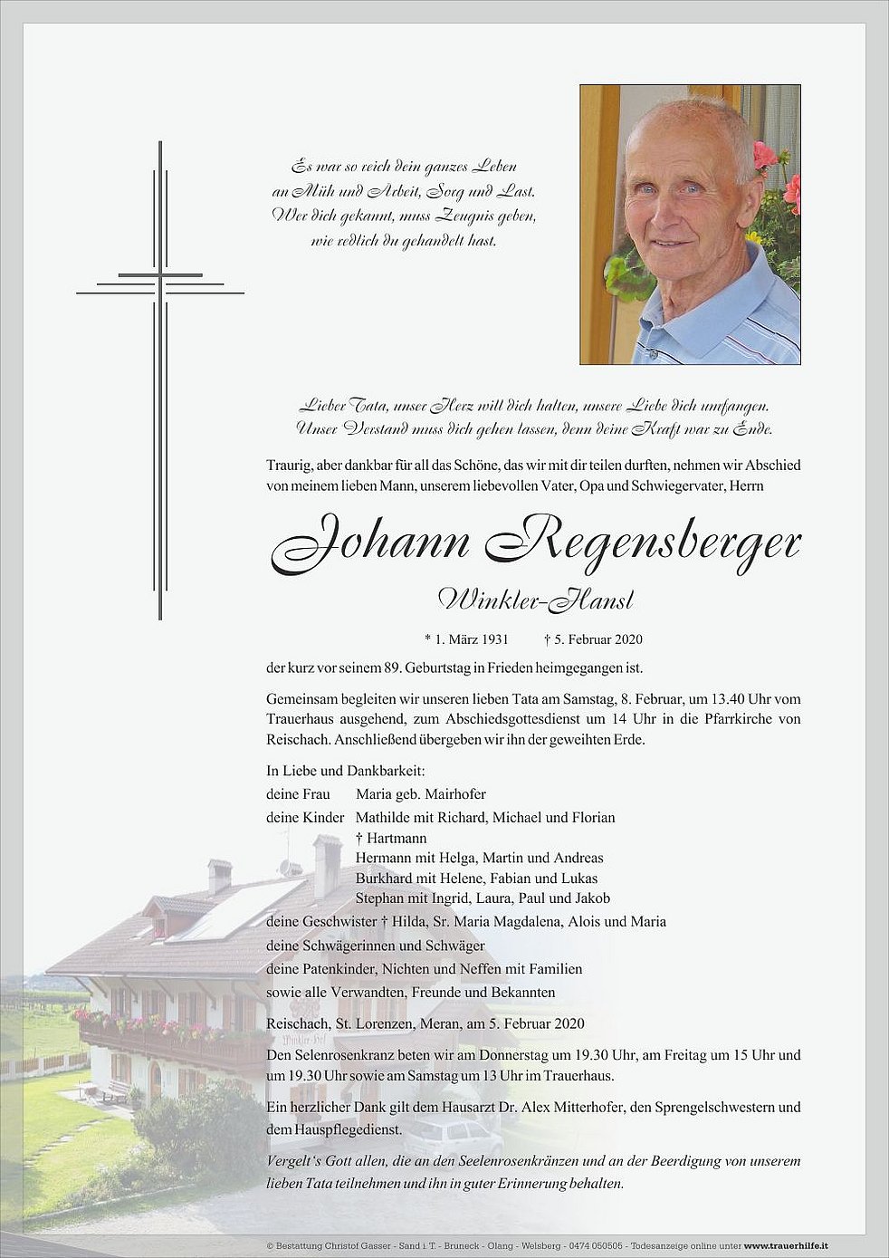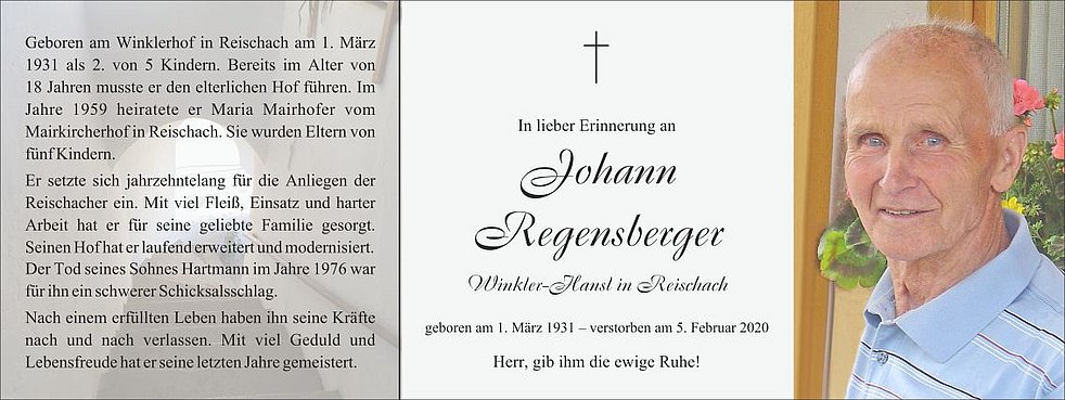 Gemeinsam begleiten wir unseren lieben Tata am Samstag, 8. Februar, um 13.40 Uhr vom Trauerhaus ausgehend, zum Abschiedsgottesdienst um 14 Uhr in die Pfarrkirche von Reischach. Anschließend übergeben wir ihn der geweihten Erde.