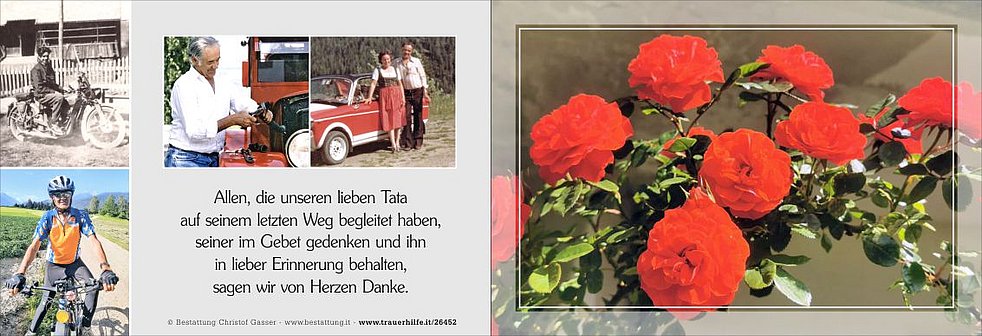 Wir sagen dir Vergelt’s Gott für alles, was du für uns getan hast, und danken dir für die schönen Jahre, die wir mit dir verbringen durften. Du hast uns allen deine Liebe und deinen Sonnenschein geschenkt. Gott der Herr nimmt dich auf in sein Reich. Wir bitten dich, uns von dort aus zu begleiten.