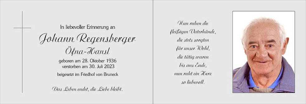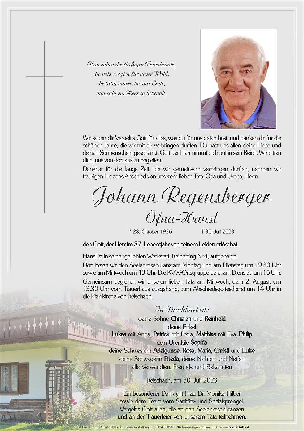 Gemeinsam begleiten wir unseren lieben Tata am Mittwoch, dem 2. August, um 13.30 Uhr vom Trauerhaus ausgehend, zum Abschiedsgottesdienst um 14 Uhr in die Pfarrkirche von Reischach.