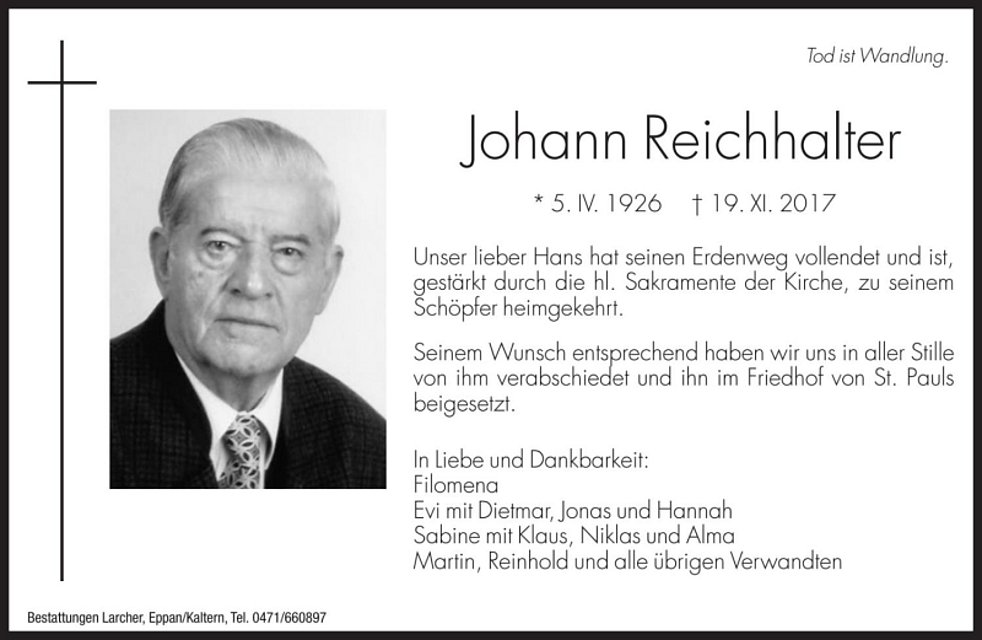 Unser lieber Hans hat seinen Erdenweg vollendet und ist, gestärkt durch die hl. Sakramente der Kirche, zu seinem Schöpfer heimgekehrt.