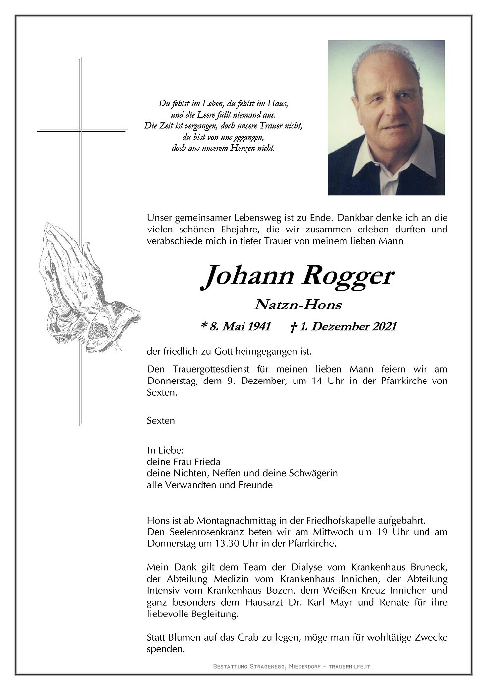 Den Trauergottesdienst für meinen lieben Mann feiern wir am Donnerstag, dem 9. Dezember, um 14 Uhr in der Pfarrkirche von Sexten.