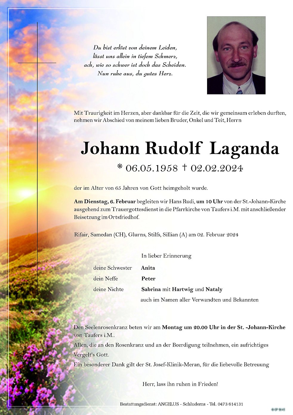 Begräbnisgottesdienst: 06.02. - 10:00 Uhr Pfarrkirche von Taufers im Münstertal