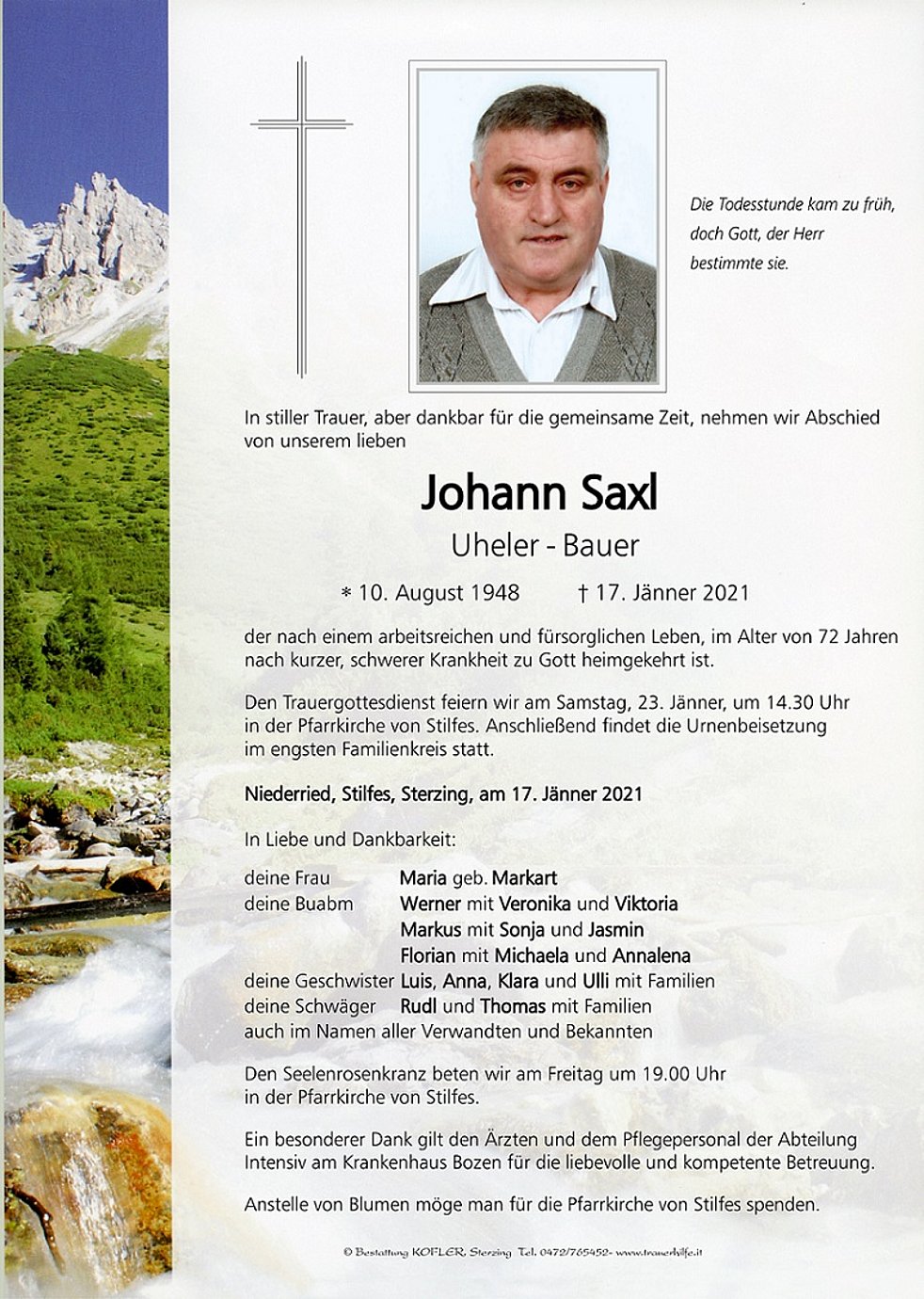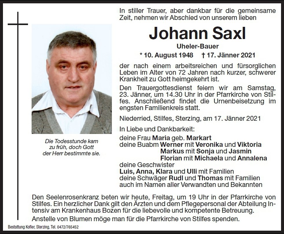 Den Trauergottesdienst feiern wir am Samstag, 23. Jänner, um 14.30 Uhr in der Pfarrkirche von Stilfes. Anschließend findet die Urnenbeisetzung im engsten Familienkreis statt.