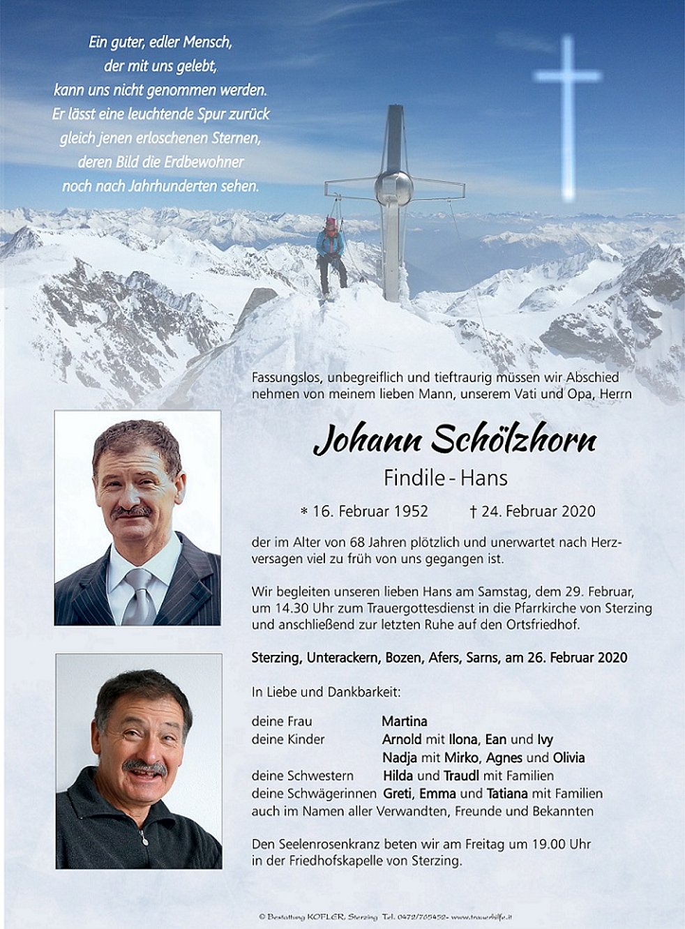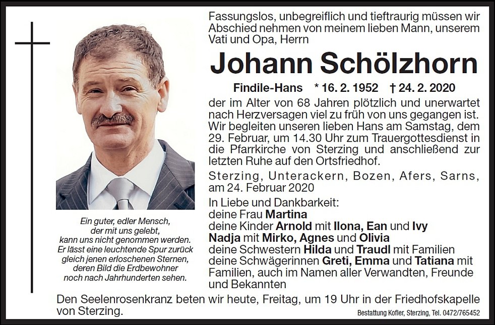 Wir begleiten unseren lieben Hans am Samstag, dem 29. Februar, um 14.30 Uhr zum Trauergottesdienst in die Pfarrkirche von Sterzing und anschließend zur letzten Ruhe auf den Ortsfriedhof.