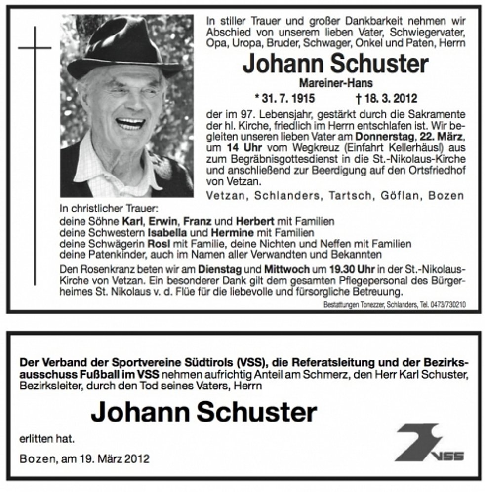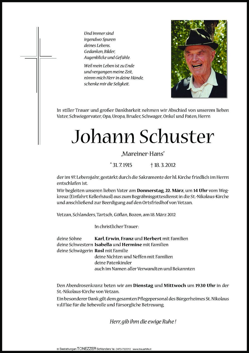 Wir begleiten unseren lieben Vater am Donnerstag, 22. März, um 14 Uhr vom Wegkreuz (Einfahrt Kellerhäusl) aus zum Begräbnisgottesdienst in die St.-Nikolaus-Kirche und anschließend zur Beerdigung auf den Ortsfriedhof von Vetzan.