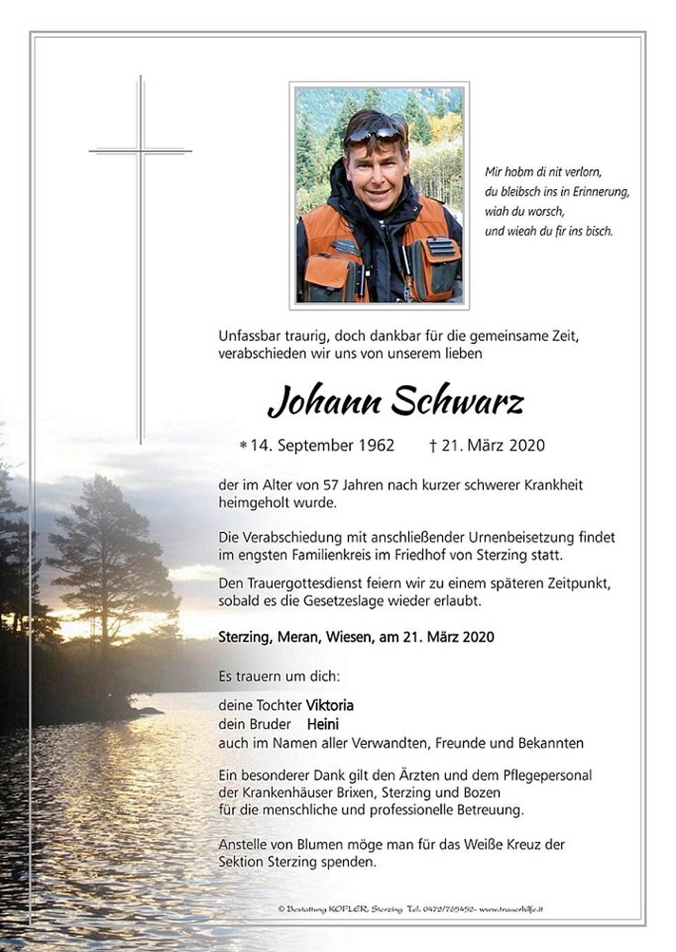 Anstelle von Blumen möge man für das Weiße Kreuz der Sektion Sterzing spenden.