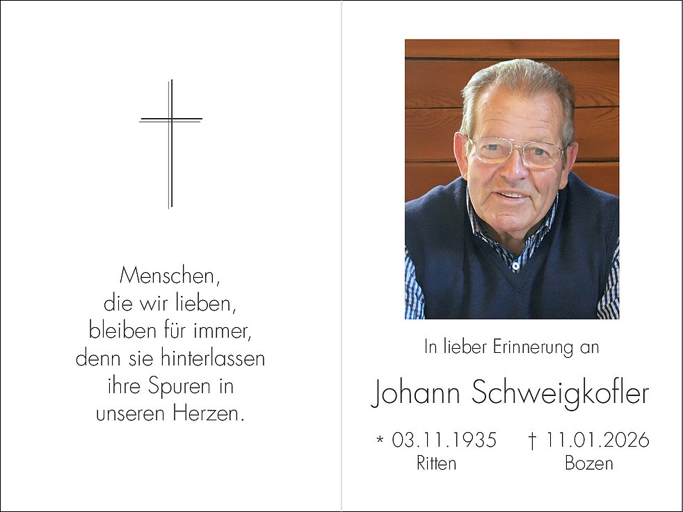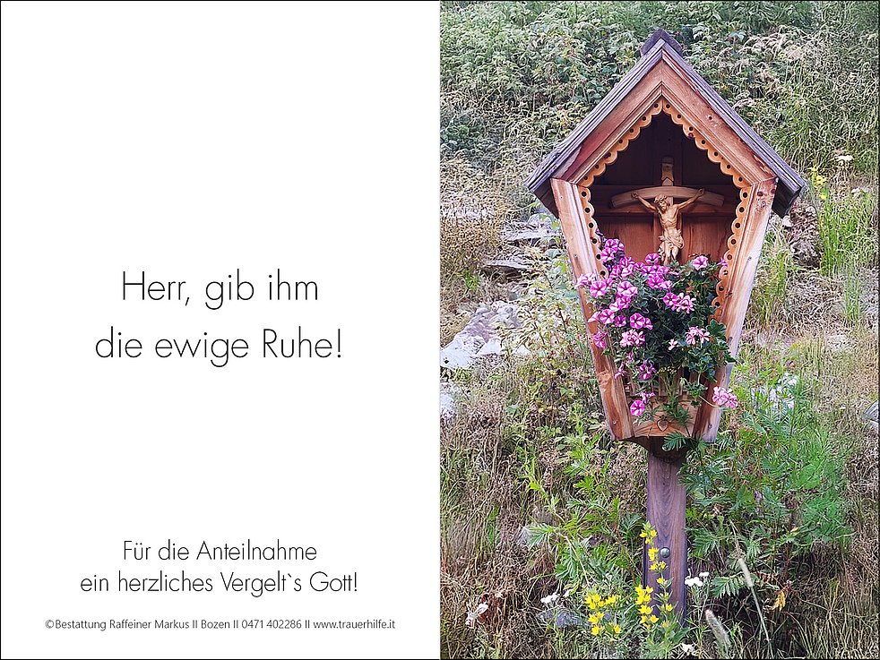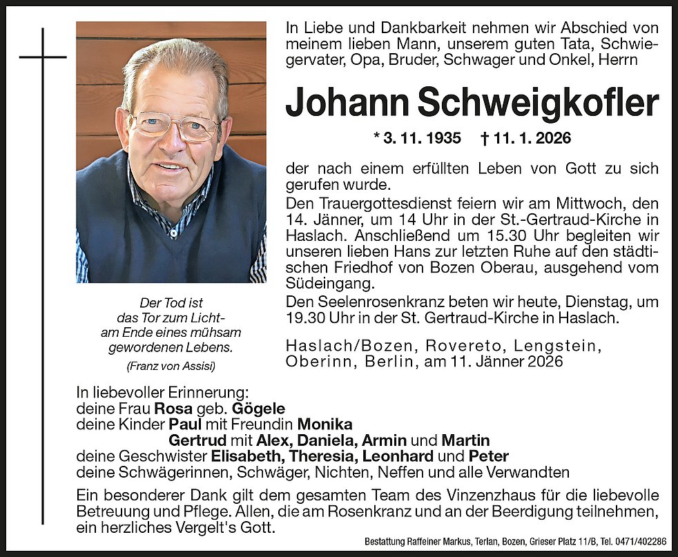 Den Trauergottesdienst feiern wir am Mittwoch, den 14. Jänner, um 14 Uhr in der St. Gertraud-Kirche in Haslach. Anschließend um 15.30 Uhr begleiten wir unseren lieben Hans zur letzten Ruhe auf den städtischen Friedhof von Bozen Oberau, ausgehend vom Südeingang.