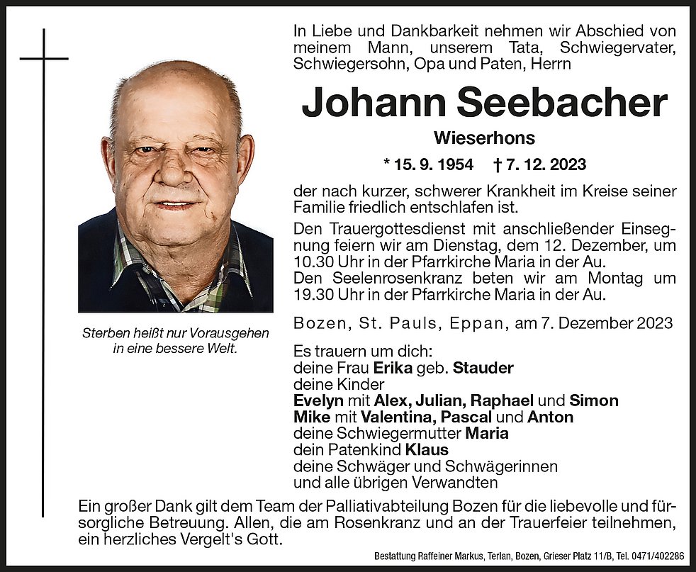 Den Trauergottesdienst mit anschließender Einsegnung feiern wir am Dienstag, dem 12. Dezember, um 10.30 Uhr in der Pfarrkirche Maria in der Au.