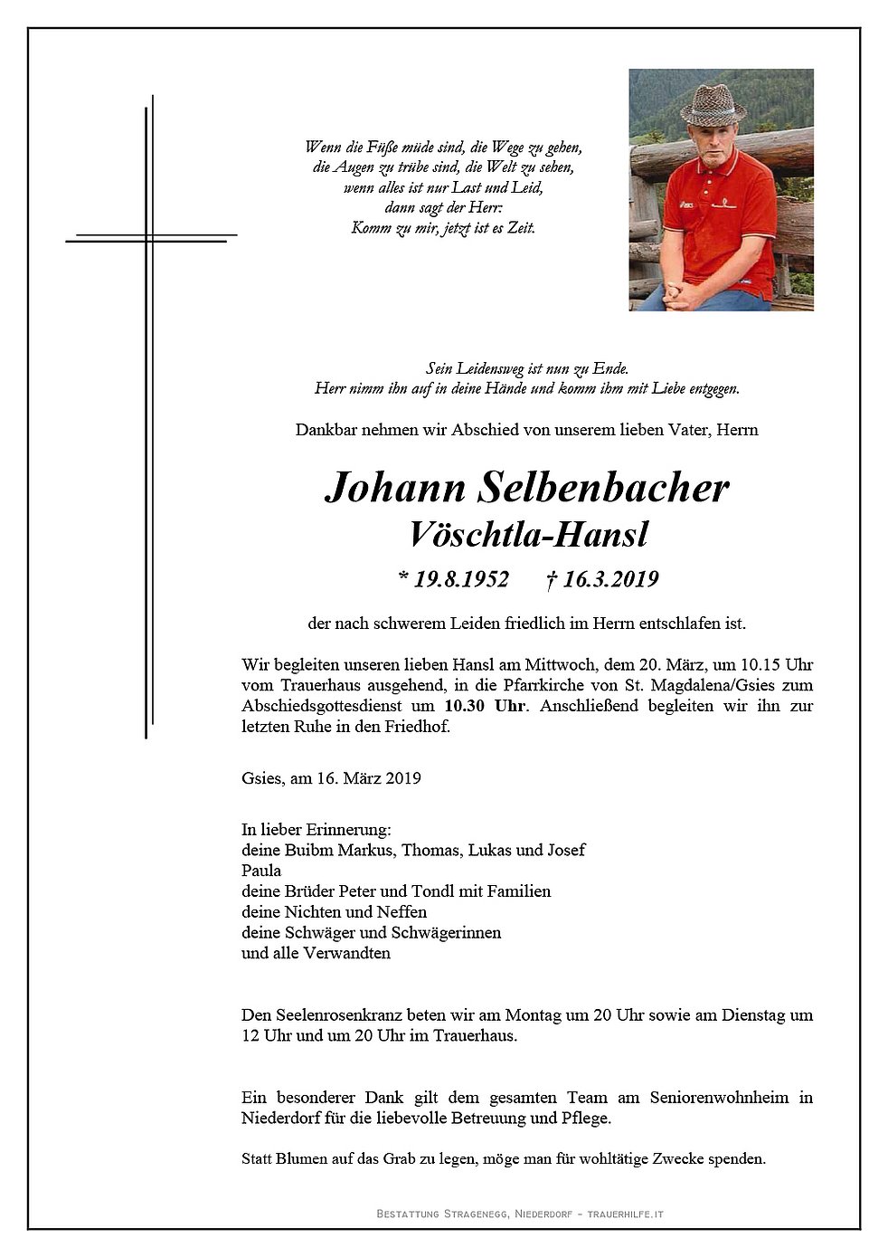 Wir begleiten unseren lieben Hansl am Mittwoch, dem 20. März, um 10.15 Uhr vom Trauerhaus ausgehend, in die Pfarrkirche von St. Magdalena/Gsies zum Abschiedsgottesdienst um 10.30 Uhr. Anschließend begleiten wir ihn zur letzten Ruhe in den Friedhof.