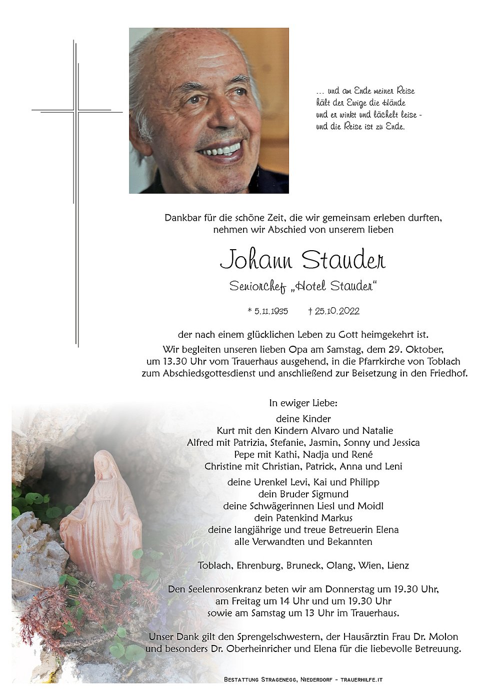 Wir begleiten unseren lieben Opa am Samstag, dem 29. Oktober, um 13.30 Uhr vom Trauerhaus ausgehend, in die Pfarrkirche von Toblach zum Abschiedsgottesdienst und anschließend zur Beisetzung in den Friedhof.