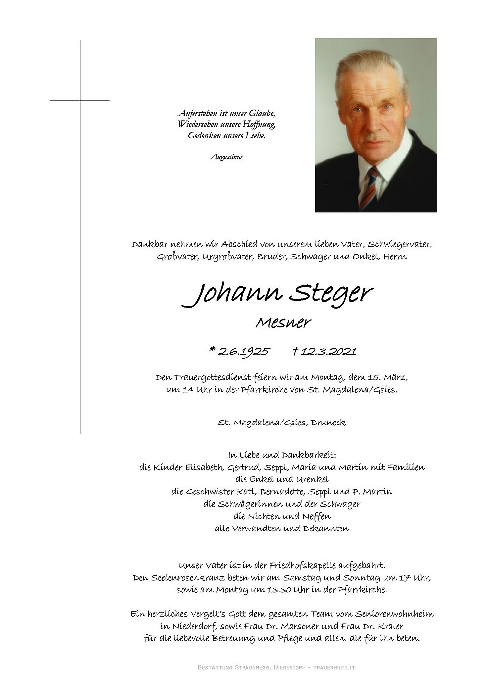 Ein herzliches Vergelt’s Gott dem gesamten Team vom Seniorenwohnheim in Niederdorf, sowie Frau Dr. Marsoner und Frau Dr. Kraler für die liebevolle Betreuung und Pflege und allen, die für ihn beten.