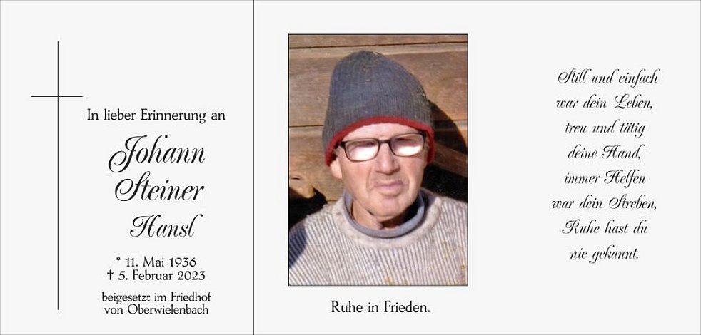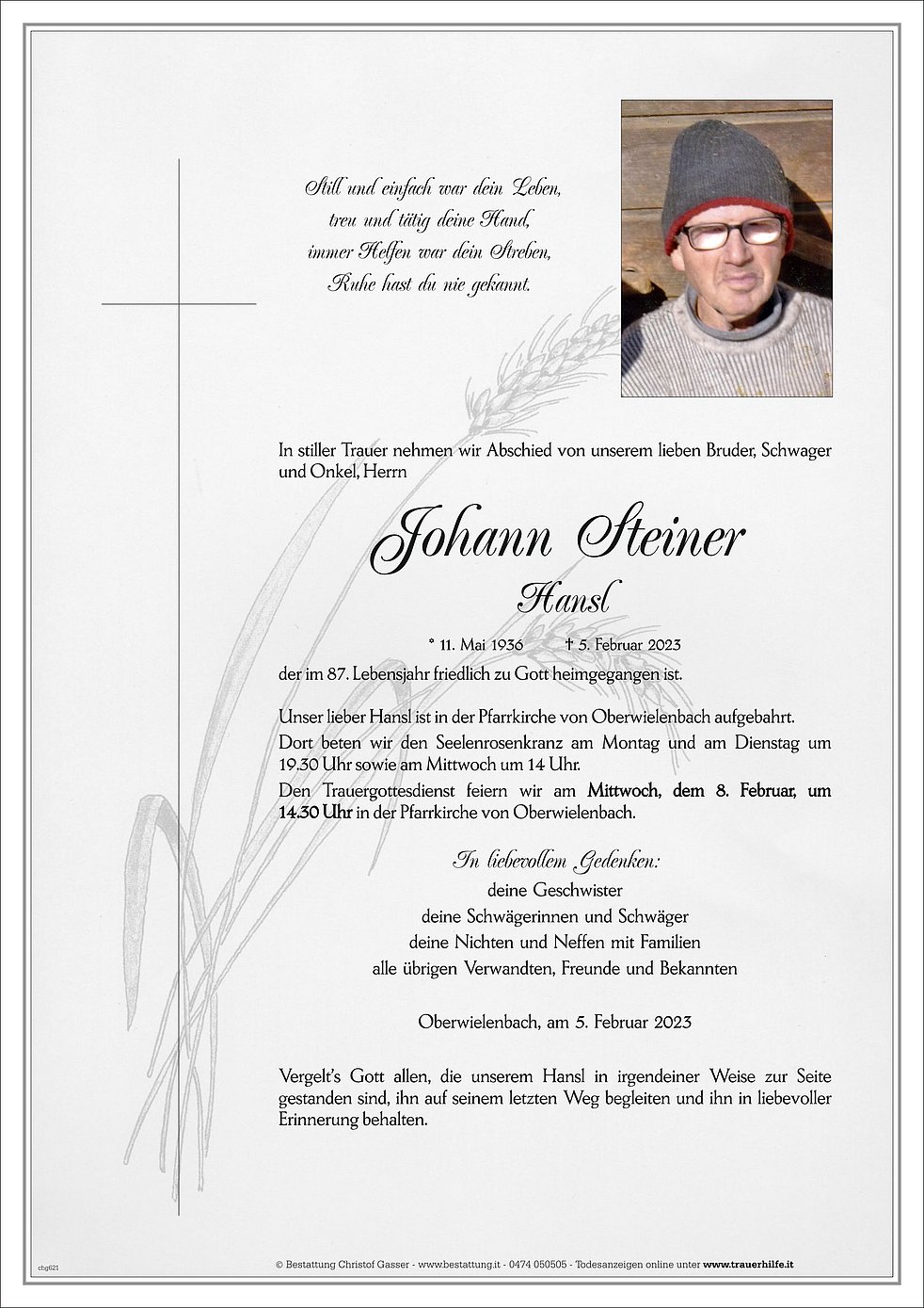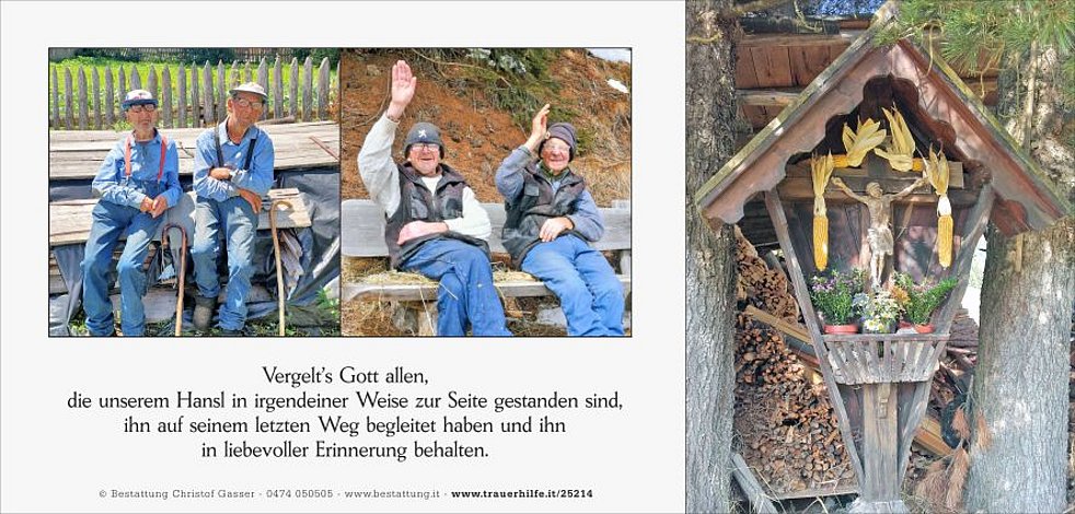 Vergelt’s Gott allen, die unserem Hansl in irgendeiner Weise zur Seite gestanden sind, ihn auf seinem letzten Weg begleiten und ihn in liebevoller Erinnerung behalten.