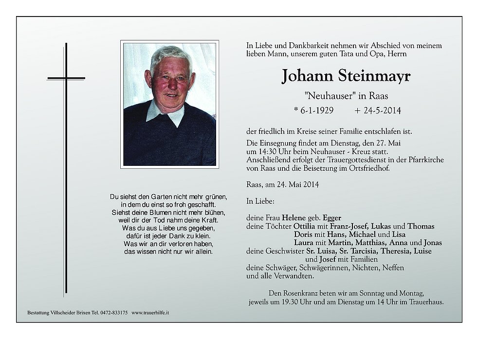 Anschließend erfolgt der Trauergottesdienst in der Pfarrkirche von Raas und die Beisetzung im Ortsfriedhof.