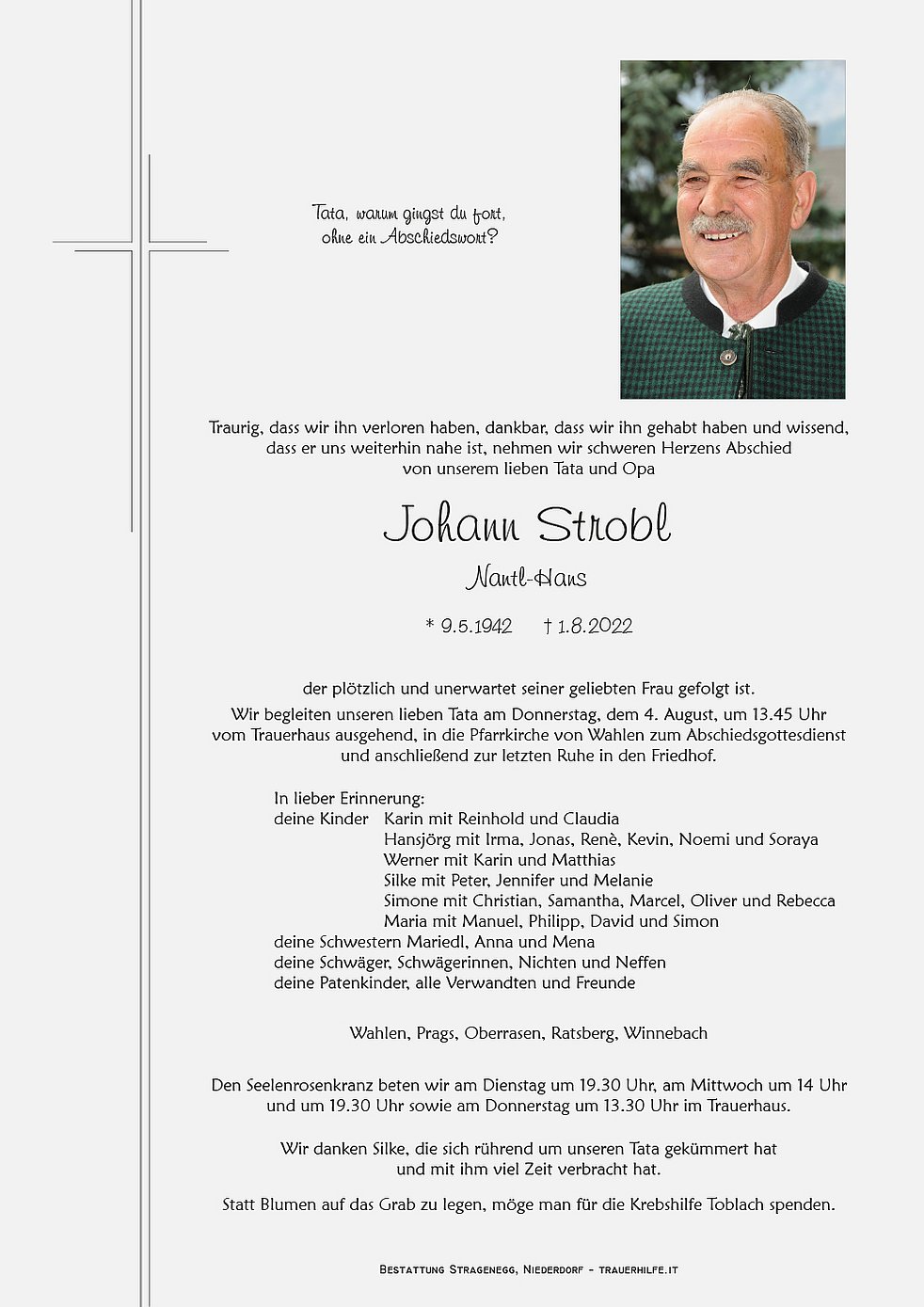 Wir begleiten unseren lieben Tata am Donnerstag, dem 4. August, um 13.45 Uhr vom Trauerhaus ausgehend, in die Pfarrkirche von Wahlen zum Abschiedsgottesdienst und anschließend zur letzten Ruhe in den Friedhof.