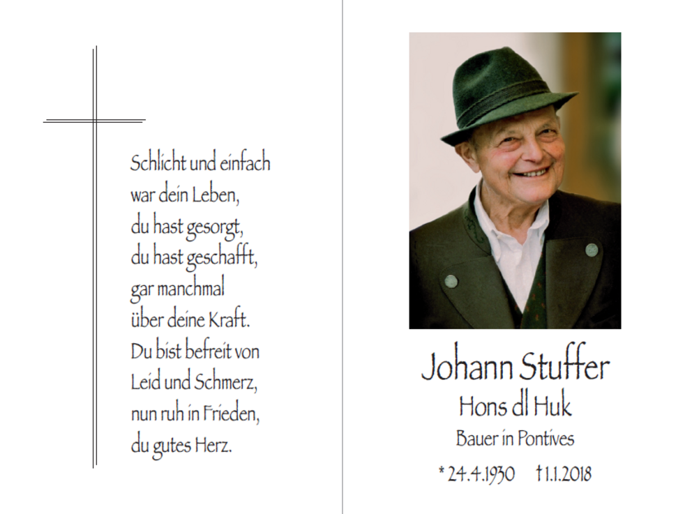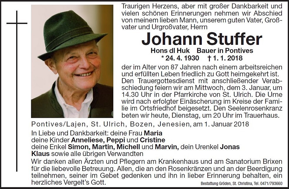 Den Trauergottesdienst mit anschließender Verabschiedung feiern wir am Mittwoch, dem 3. Januar, um 14.30 Uhr in der Pfarrkirche von St. Ulrich. Die Urne wird nach erfolgter Einäscherung im Kreise der Familie im Ortsfriedhof beigesetzt.