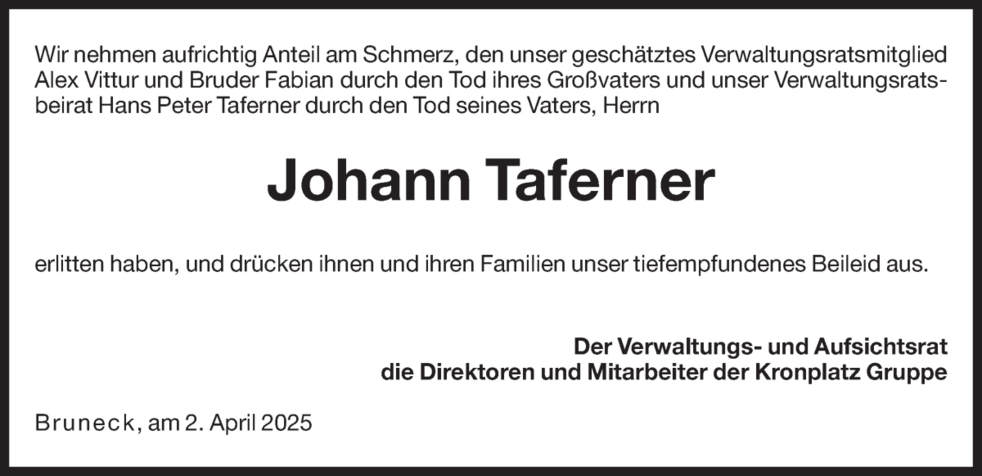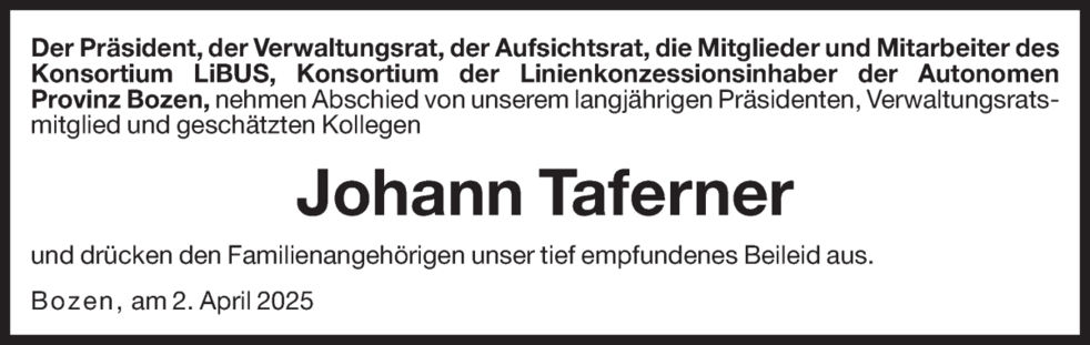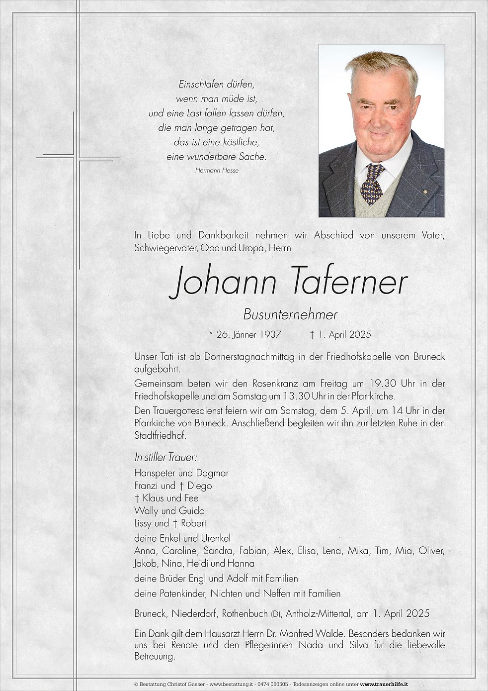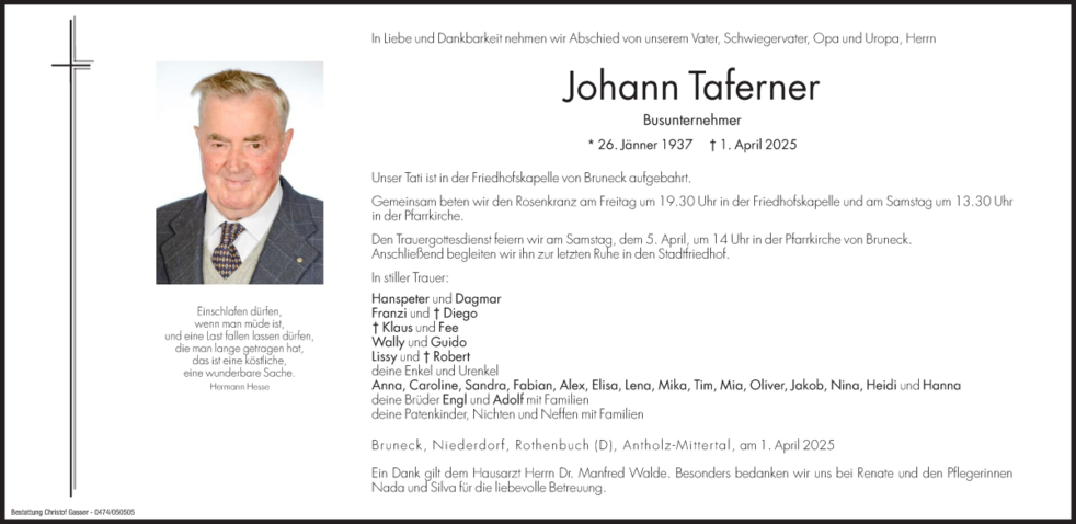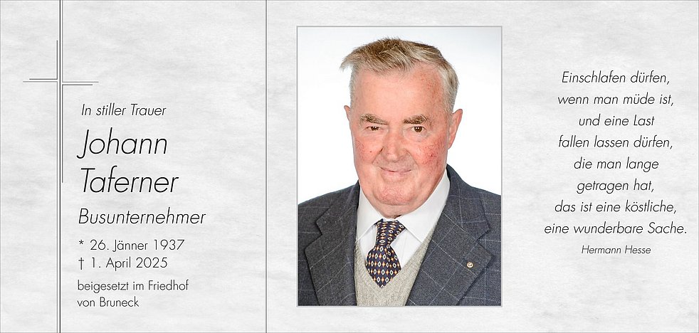 Den Trauergottesdienst feiern wir am Samstag, dem 5. April, um 14 Uhr in der Pfarrkirche von Bruneck.