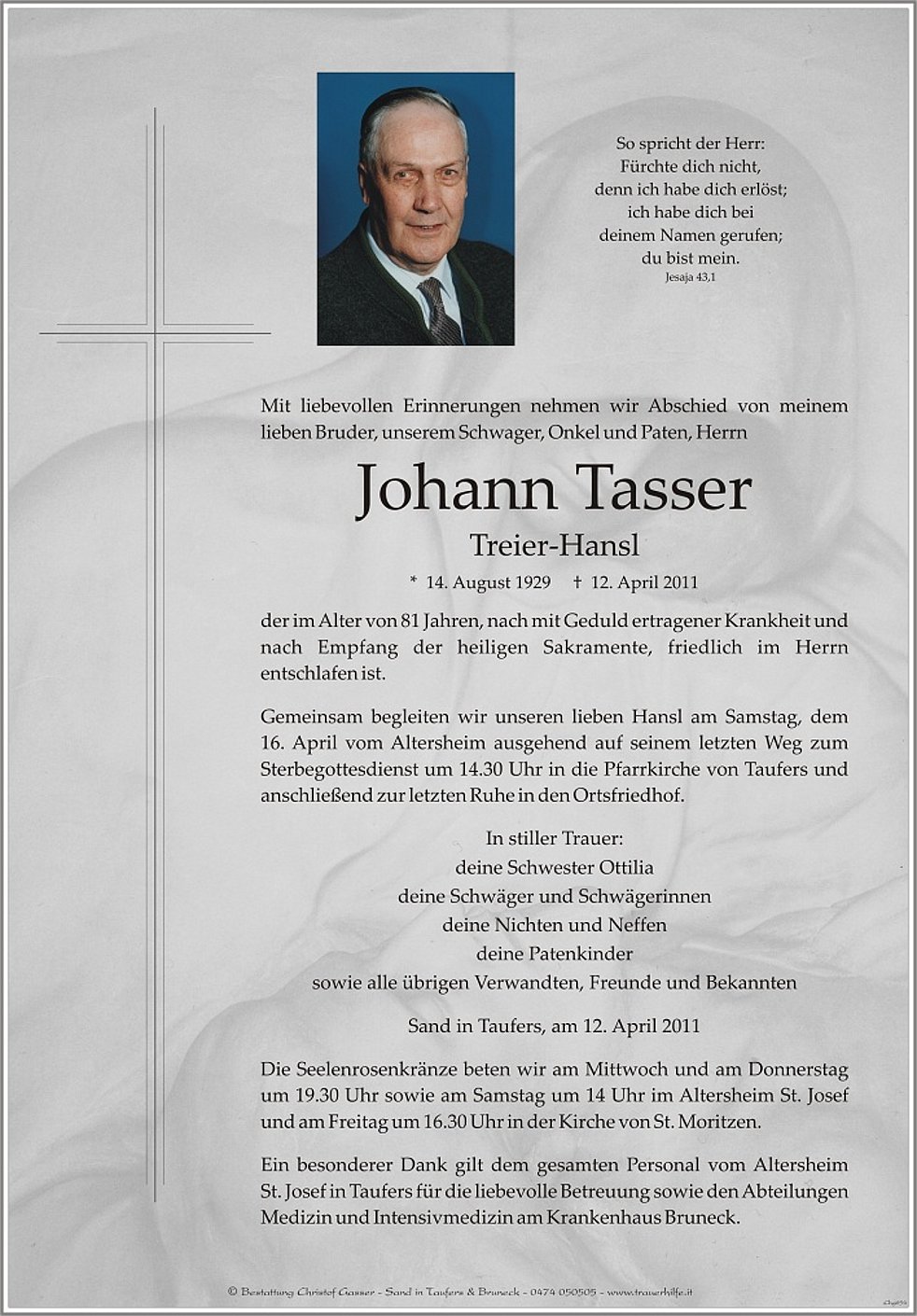 16. April vom Altersheim ausgehend auf seinem letzten Weg zum Sterbegottesdienst um 14.30 Uhr in die Pfarrkirche von Taufers und anschließend zur letzten Ruhe in den Ortsfriedhof.