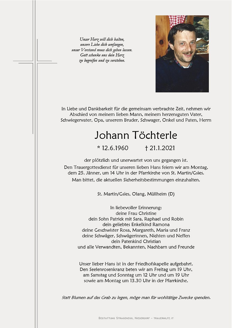 Den Trauergottesdienst für unseren lieben Hans feiern wir am Montag, dem 25. Jänner, um 14 Uhr in der Pfarrkirche von St. Martin/Gsies.