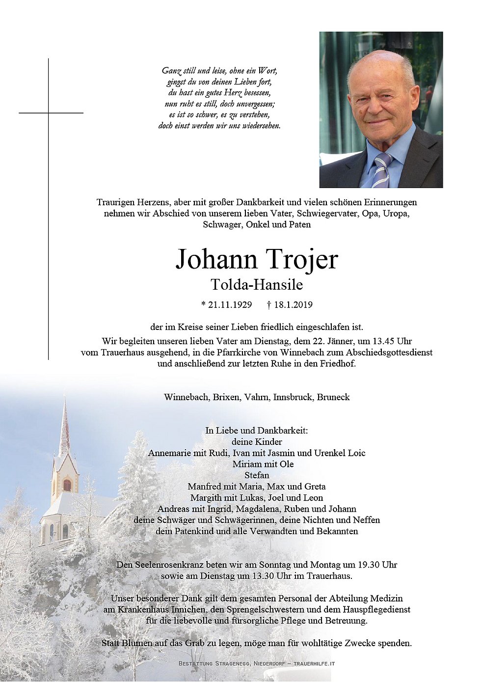 Wir begleiten unseren lieben Vater am Dienstag, dem 22. Jänner, um 13.45 Uhr vom Trauerhaus ausgehend, in die Pfarrkirche von Winnebach zum Abschiedsgottesdienst und anschließend zur letzten Ruhe in den Friedhof.