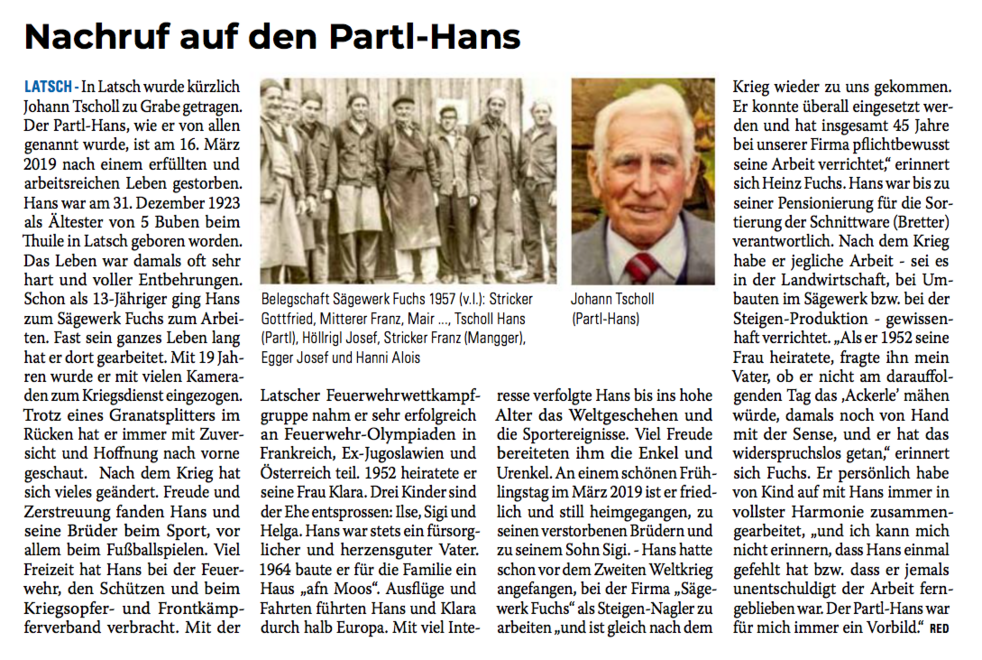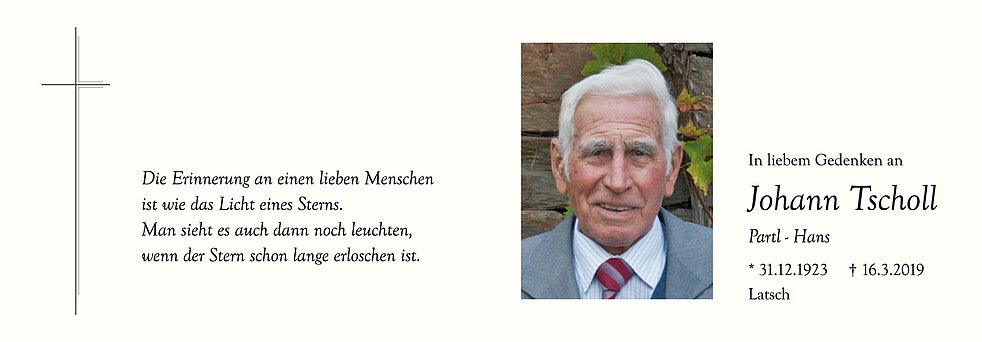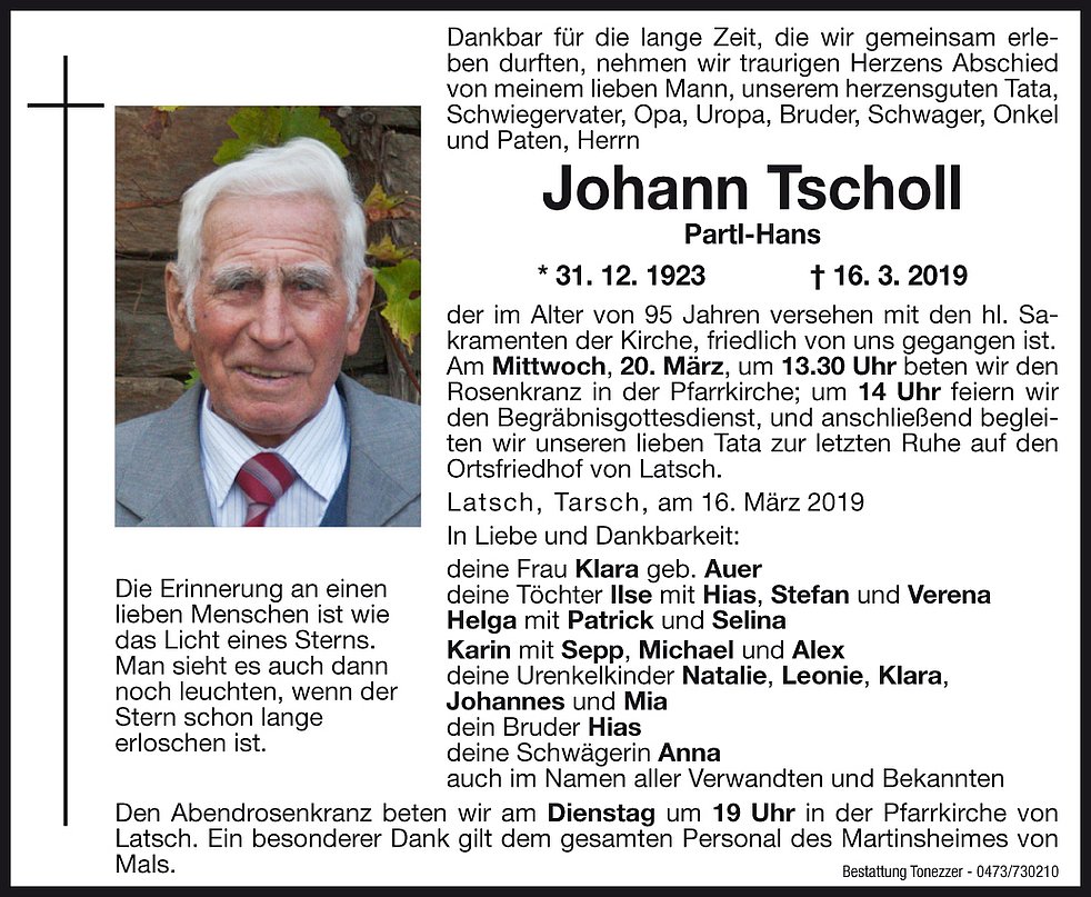 um 14 Uhr feiern wir den Begräbnisgottesdienst, und anschließend begleiten wir unseren lieben Tata zur letzten Ruhe auf den Ortsfriedhof von Latsch.