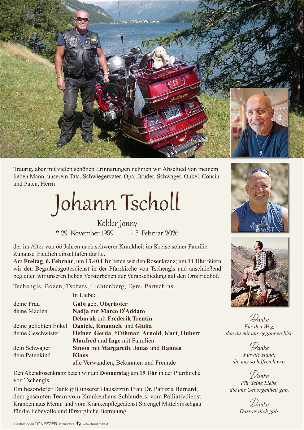 Am Freitag, 6. Februar, um 13.40 Uhr beten wir den Rosenkranz; um 14 Uhr feiern wir den Begräbnisgottesdienst in der Pfarrkirche von Tschengls und anschließend begleiten wir unseren lieben Verstorbenen zur Verabschiedung auf den Ortsfriedhof.