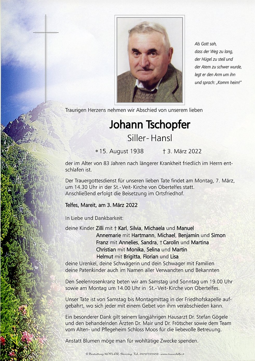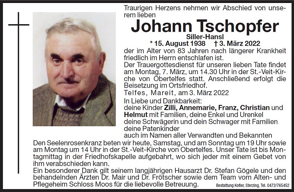 Der Trauergottesdienst für unseren lieben Tate findet am Montag, 7. März, um 14.30 Uhr in der St.-Veit- Kirche von Obertelfes statt. Anschließend erfolgt die Beisetzung im Ortsfriedhof.