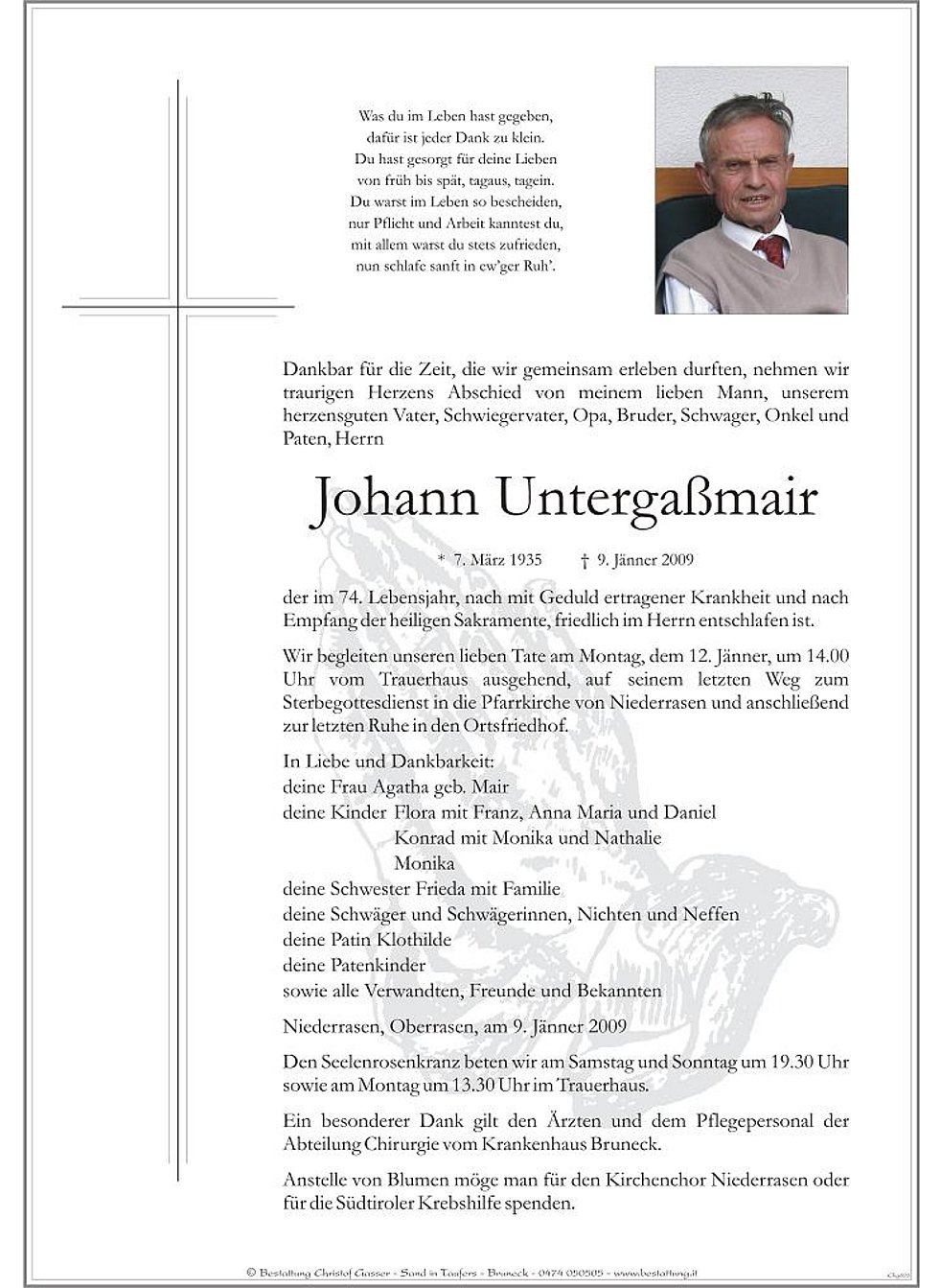 Wir begleiten unseren lieben Tate am Montag, dem 12. Jänner, um 14.00 Uhr vom Trauerhaus ausgehend, auf seinem letzten Weg zum Sterbegottesdienst in die Pfarrkirche von Niederrasen und anschließend zur letzten Ruhe in den Ortsfriedhof.