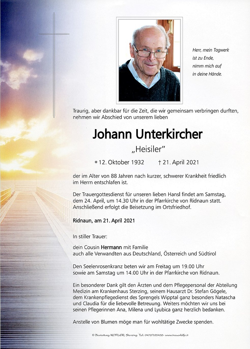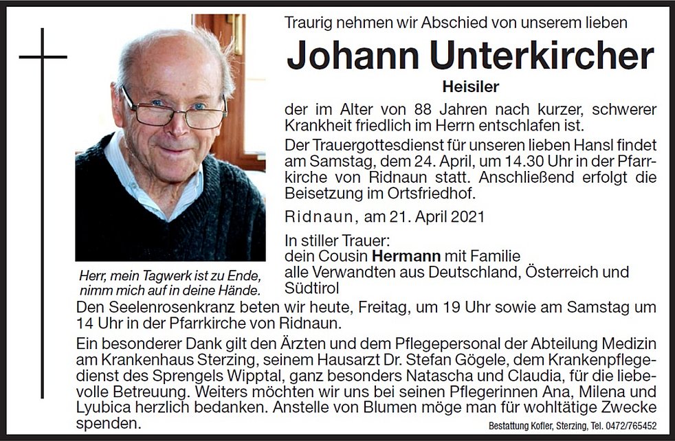 Der Trauergottesdienst für unseren lieben Hansl findet am Samstag, dem 24. April, um 14.30 Uhr in der Pfarrkirche von Ridnaun statt.